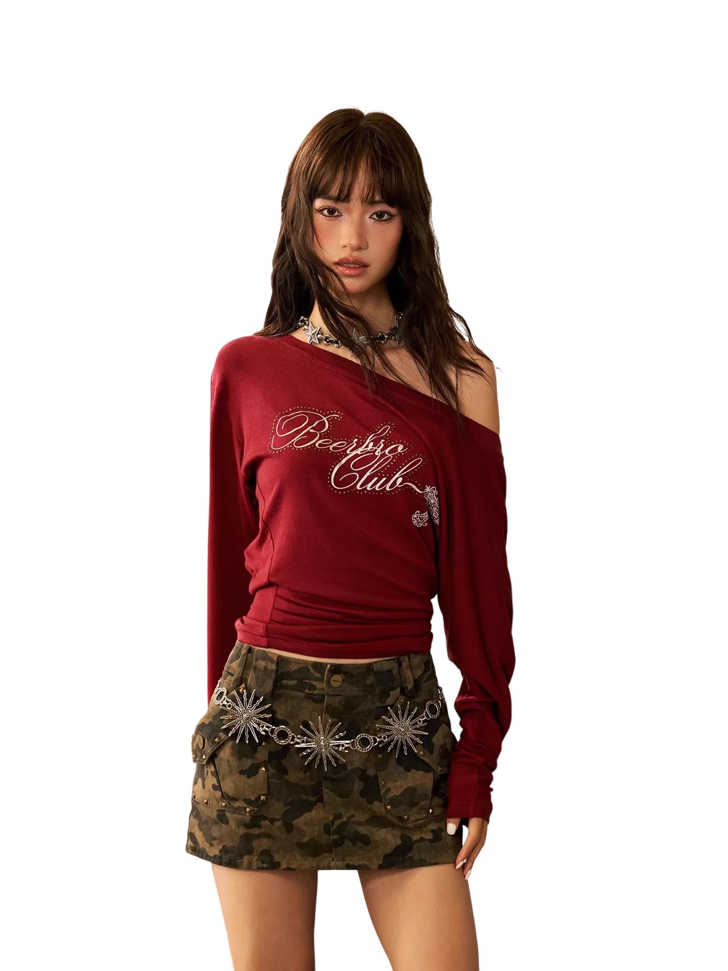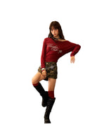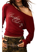 Elevate your urban wardrobe with this off-shoulder slim fit knit top. Designed with long sleeves and crafted from a soft blend of wool and Tencel, it offers both comfort and a flattering silhouette. The top features a striking chest detail with stylized text and a modern fit, making it a perfect layering piece or standout on its own. Ideal for trend-forward women seeking contemporary style with a chic edge.