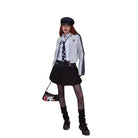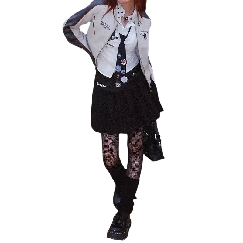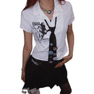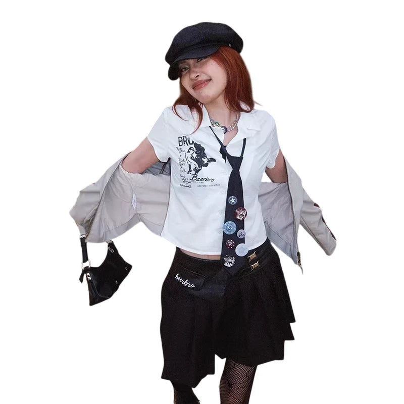 This stylish accessory set features a black necktie adorned with colorful graphic pins, perfect for adding a bold, preppy flair to any outfit. Designed for women, the tie pairs effortlessly with a white button-up shirt that includes eye-catching graphic prints. The coordinated look is ideal for streetwear or alternative fashion styles, and it brings a touch of playful rebellion to classic preppy attire. A perfect addition to layered outfits for an edgy, urban aesthetic.