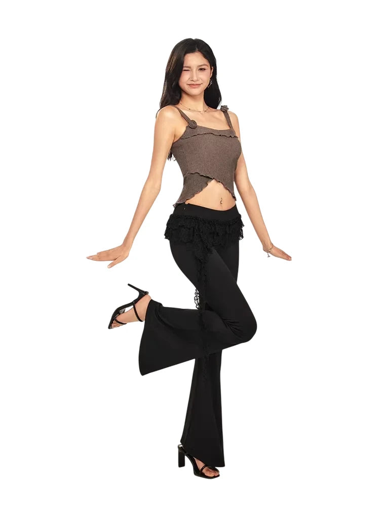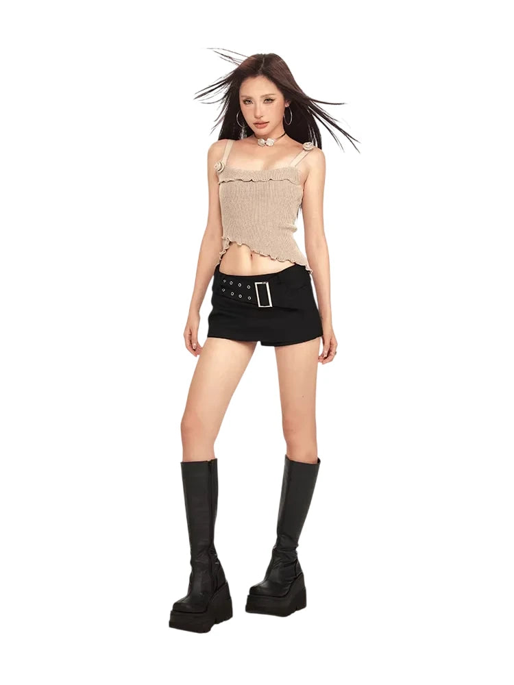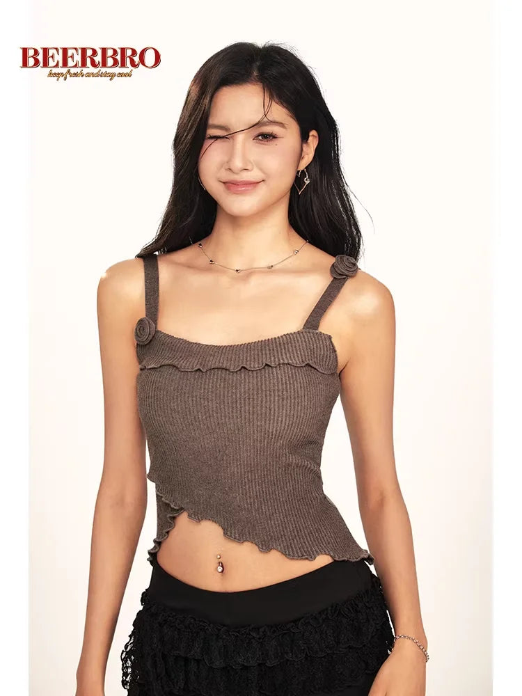Embrace vintage charm with this retro-inspired knitted crop vest for women. Featuring a ribbed design and a snug, feminine fit, this sleeveless top is adorned with rose-like floral embellishments on the shoulder straps for an elegant touch. The wavy ruffle detailing along the neckline and asymmetrical hem adds a soft, stylish flair. Ideal for casual summer outfits, the stretchy, comfortable fabric makes it both fashionable and versatile.