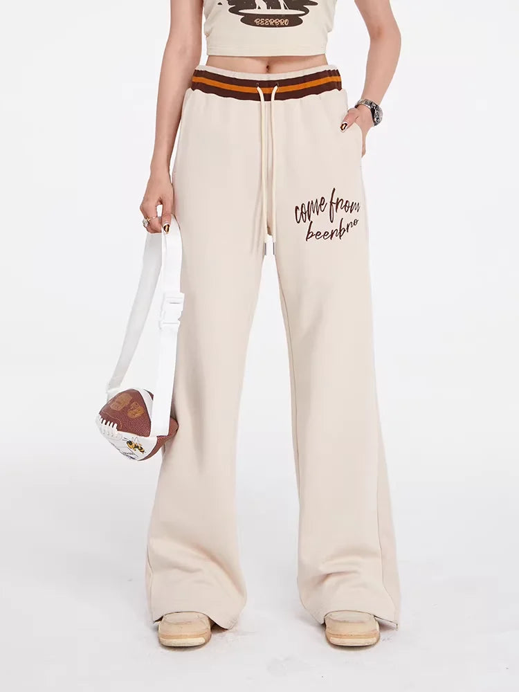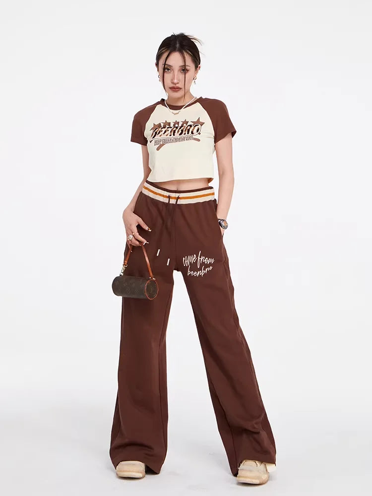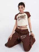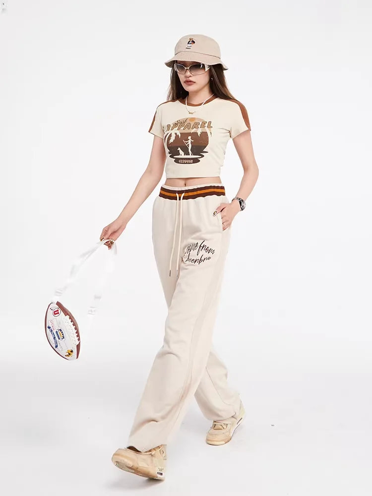 Elevate your casual wardrobe with this trendy two-piece set for women, featuring a cream-colored cropped graphic t-shirt and high-waisted jogger pants. The top showcases a vintage-inspired print, while the pants offer a comfortable wide-leg fit, drawstring waist, and unique retro patchwork embroidery. The beige joggers are accented with rust and brown stripes on the waistband and stylish lettering on the upper thigh, perfect for laid-back summer days or sporty outings.