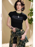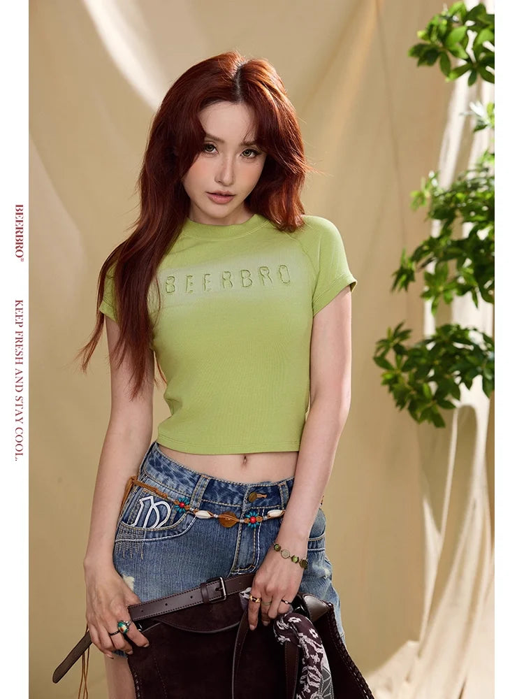 This women's slim fit cropped T-shirt features a stylish short sleeve design with distressed raglan sleeves, offering a modern, casual look perfect for warm weather. Made from combed cotton with anti-pilling properties, it provides a soft, durable feel. The embossed chest detail adds a subtle visual element, ideal for everyday wear or relaxed outings.