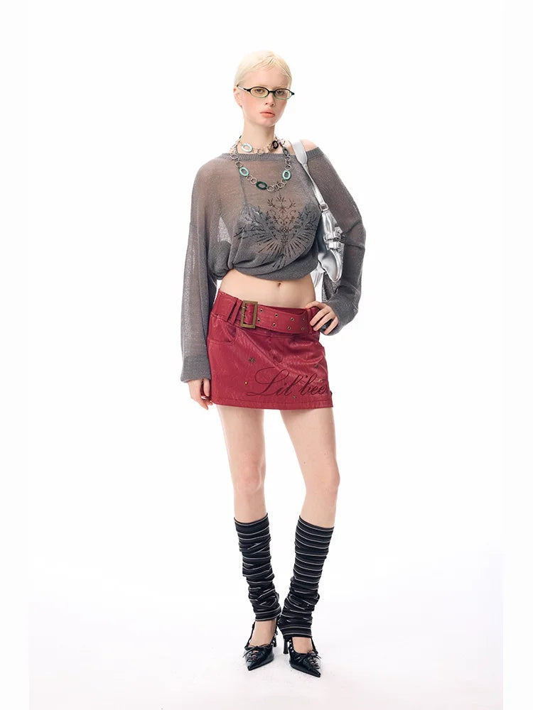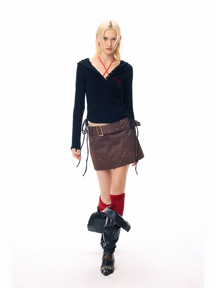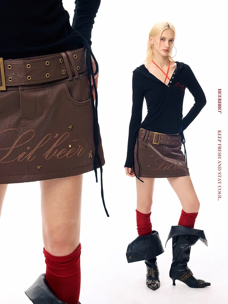 This edgy and fashionable women's mini skirt features a brown faux leather construction adorned with gold script and star embellishments for a bold, standout look. Designed in an A-line silhouette, it is finished with a wide waistband secured by metallic grommets and a statement buckle. Ideal for trendsetters embracing Y2K-inspired fashion, this skirt combines attitude and flair for a youthful, street-style appearance.