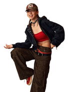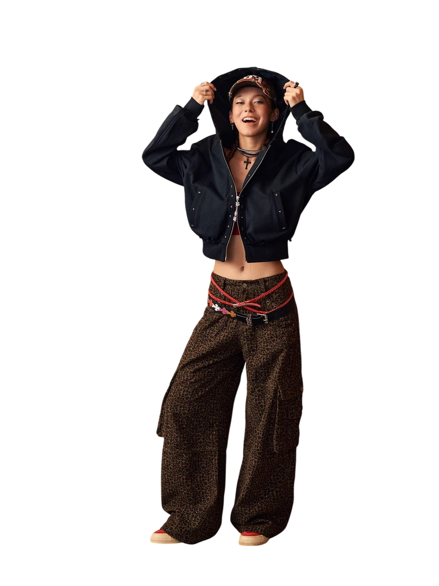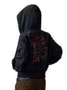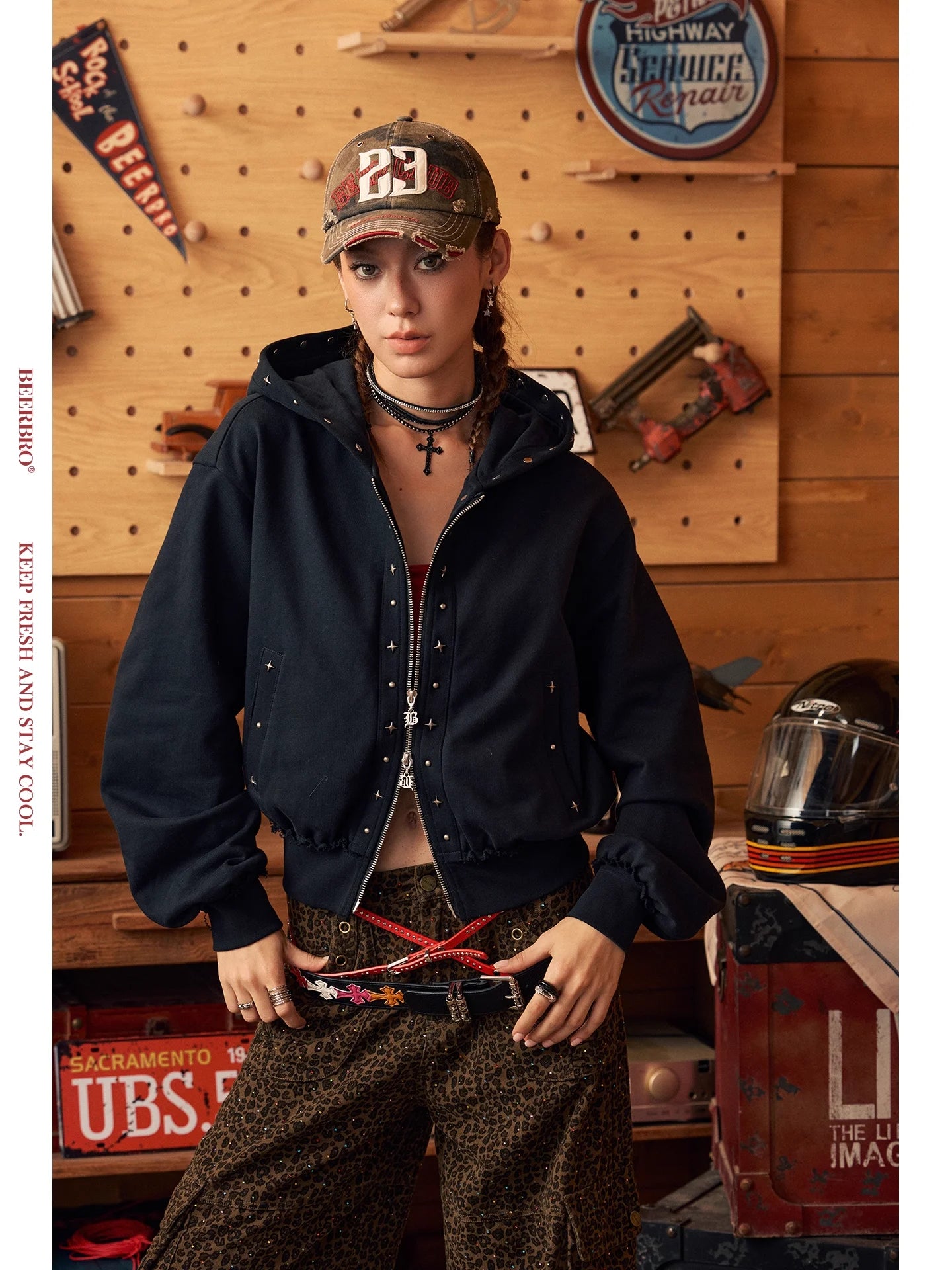 This women's zip-up sweatshirt jacket features a soft, skin-friendly fabric with a loose fit for a relaxed look. Designed with subtle studded foil prints and ruched cuffs, it presents a modern, edgy aesthetic. The structured hood and front zipper details add functionality and style, making it a versatile piece for everyday wear or statement fashion ensembles.