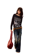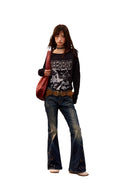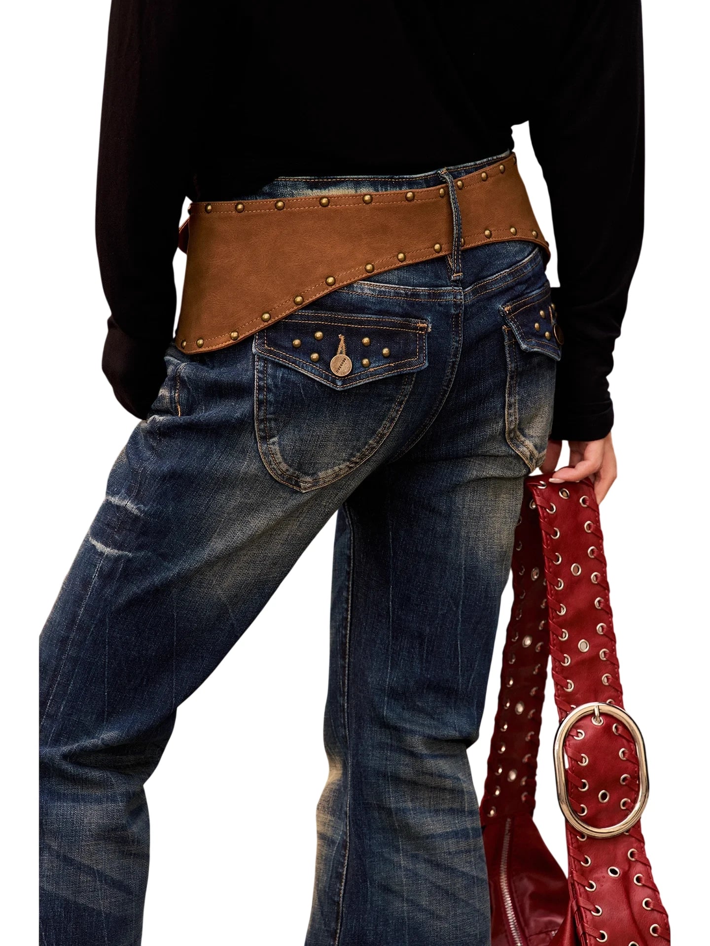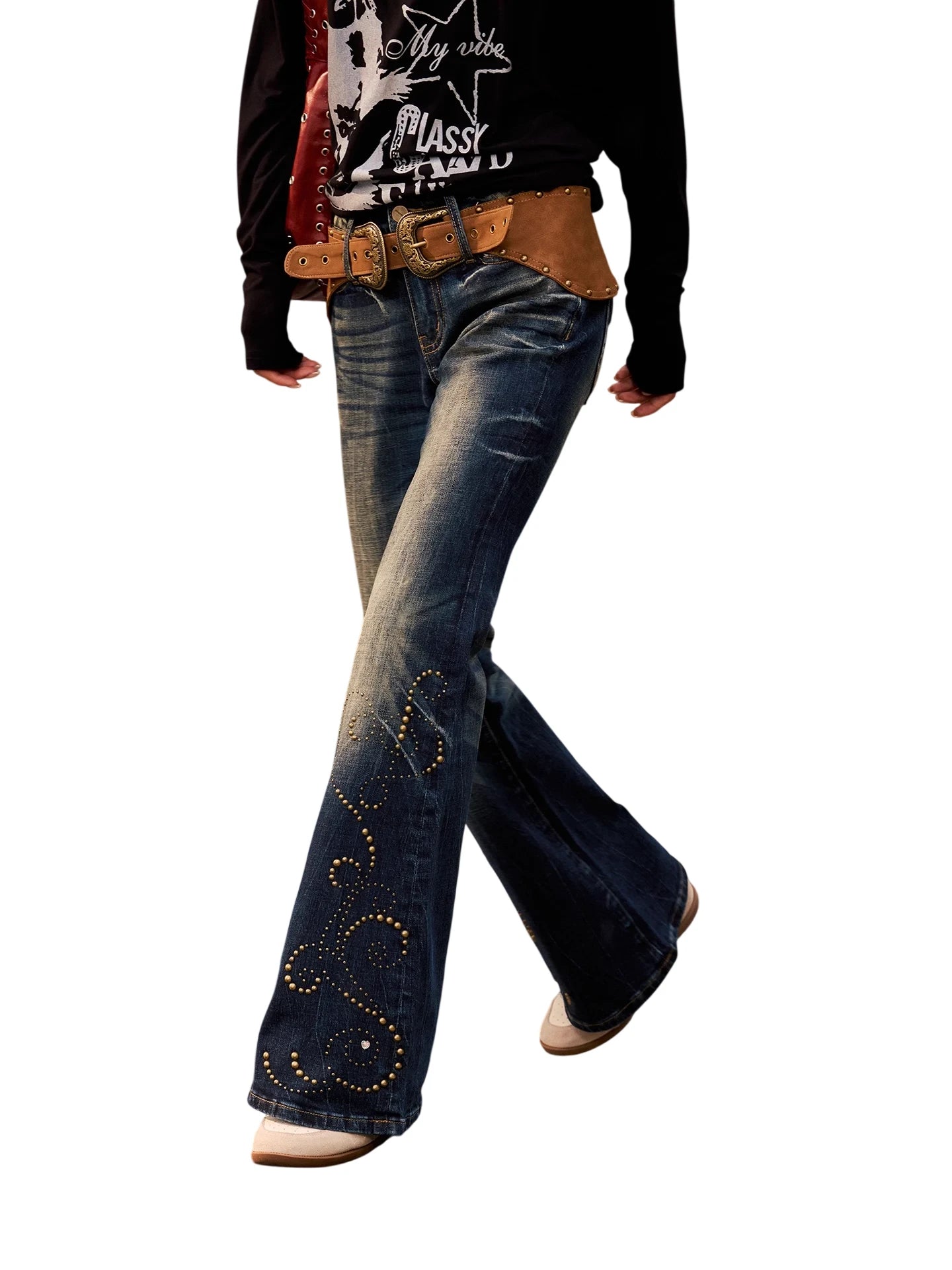 Elevate your Western-inspired wardrobe with these women's slim flared jeans. Crafted with a heavy vintage wash, they feature elegant gold stud and rhinestone embellishments near the lower legs. The mid-rise design is complemented by a wide double-buckle suede belt for added flair. Perfect for creating stylish bohemian looks with a touch of rustic charm.