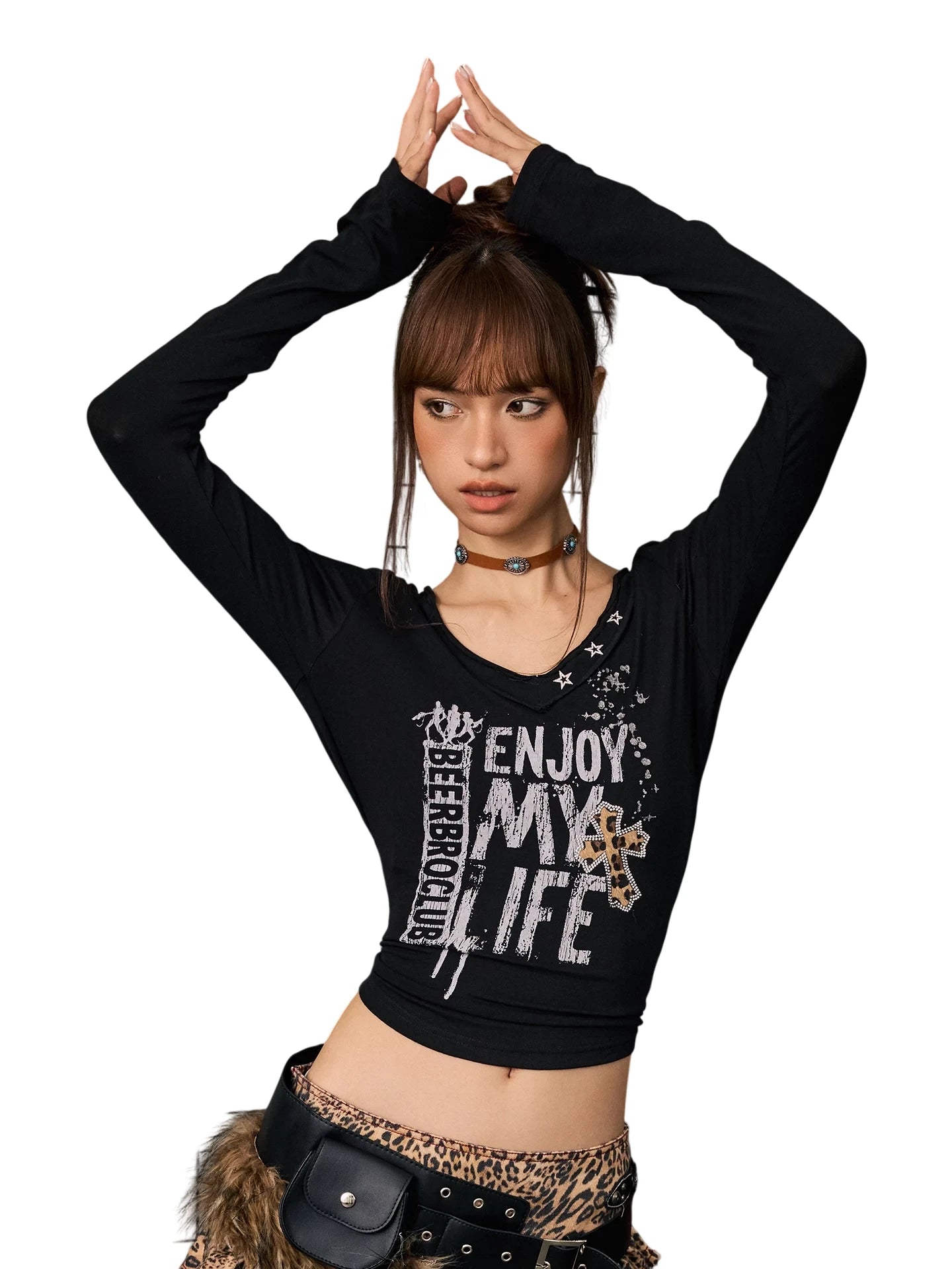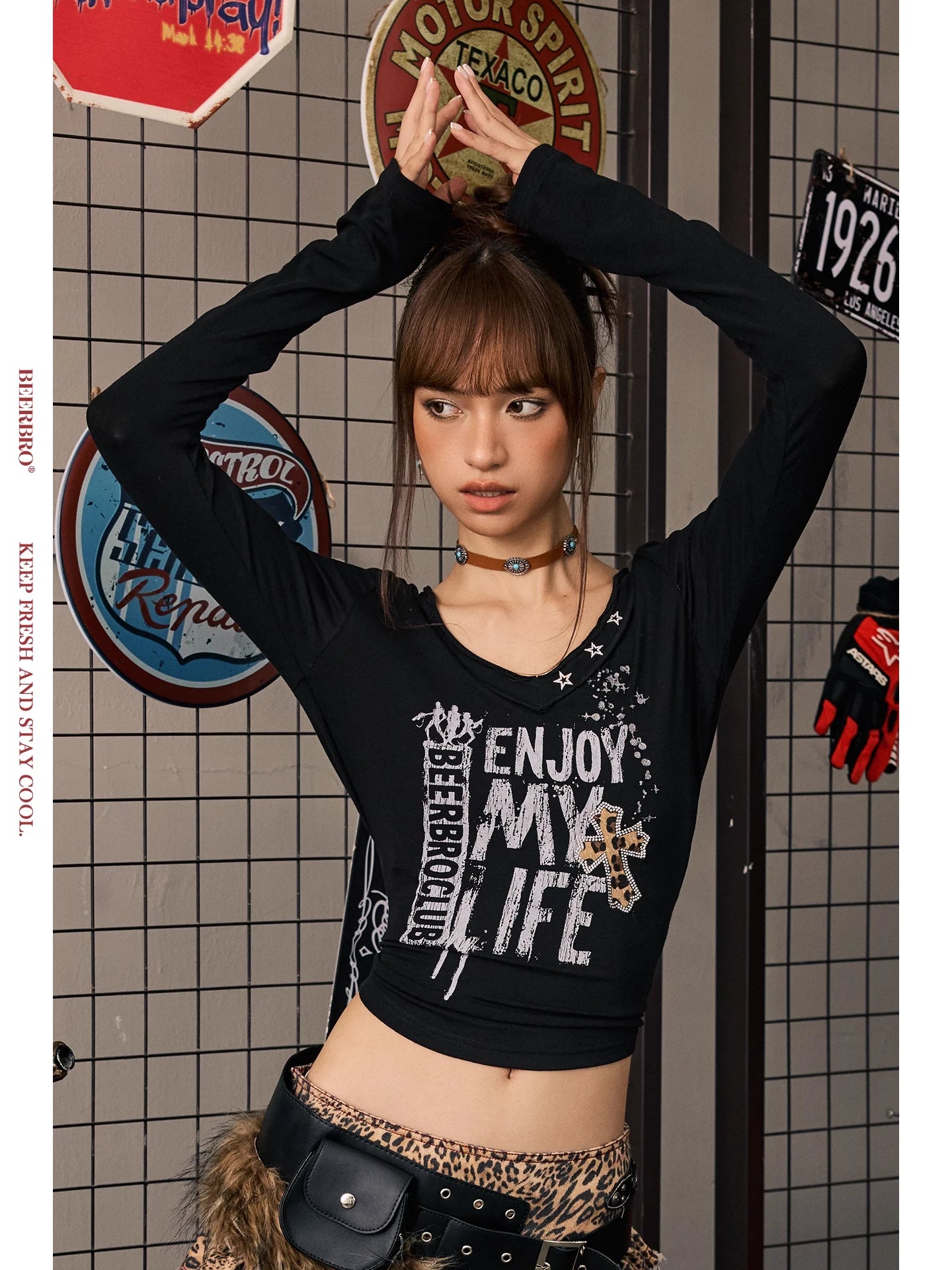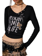Make a bold statement with this stylish women's long-sleeve crop top, crafted from a breathable and skin-friendly Tencel wool blend. Featuring a flattering V-neckline and an eye-catching rhinestone print that says “ENJOY MY LIFE” with “BEERBRO CLUB” detail, this fitted top adds a trendy edge to your casual wardrobe. Faux fur cuffs lend an extra touch of texture and flair, making it perfect for layering or standalone wear. Ideal for showcasing youthful, edgy styling with comfort in mind.