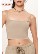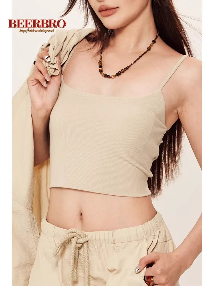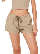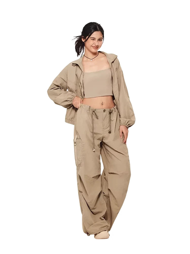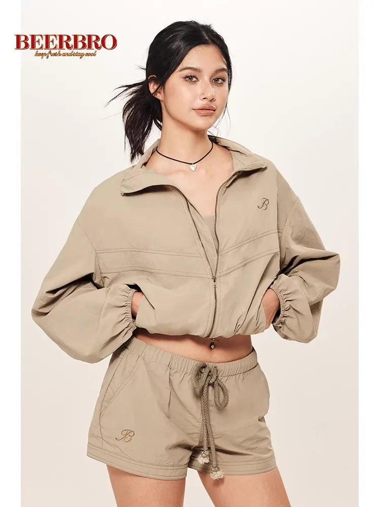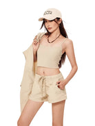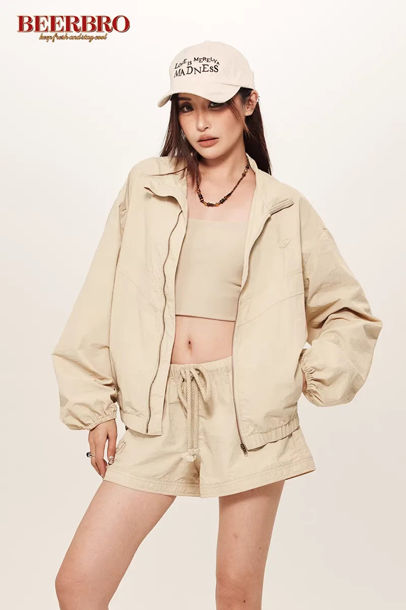 This stylish three-piece athleisure set for women features a coordinated look perfect for casual outings or light outdoor activities. The set includes a lightweight sun-protective windbreaker jacket with a full zip and elasticated cuffs, a cropped camisole-style tank top, and relaxed drawstring shorts. Designed in a monochromatic beige tone, the outfit combines sporty function with effortless style.