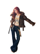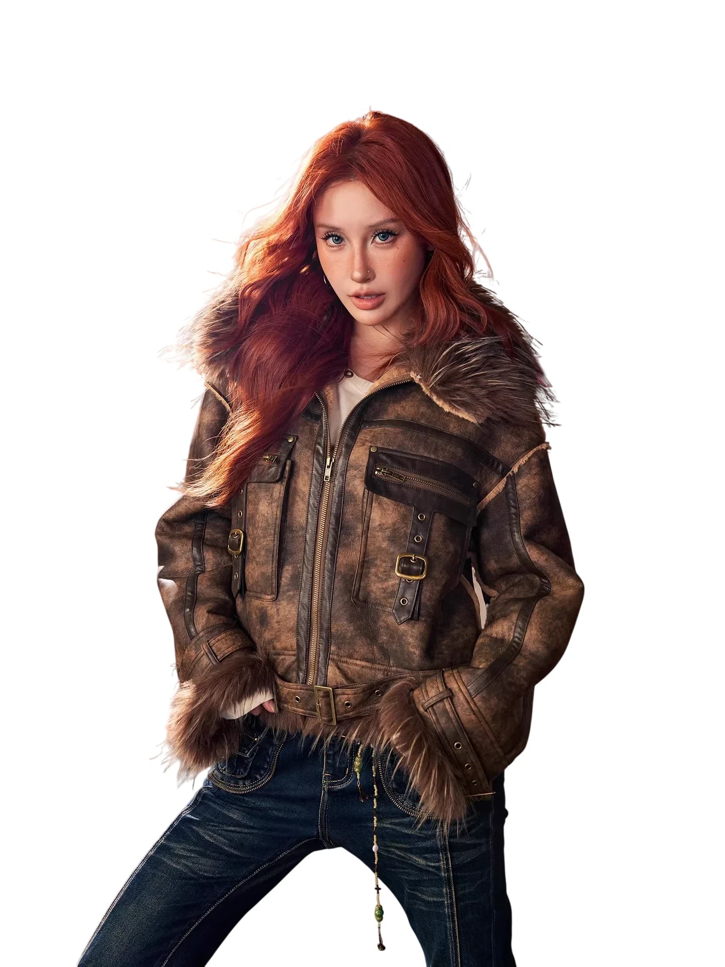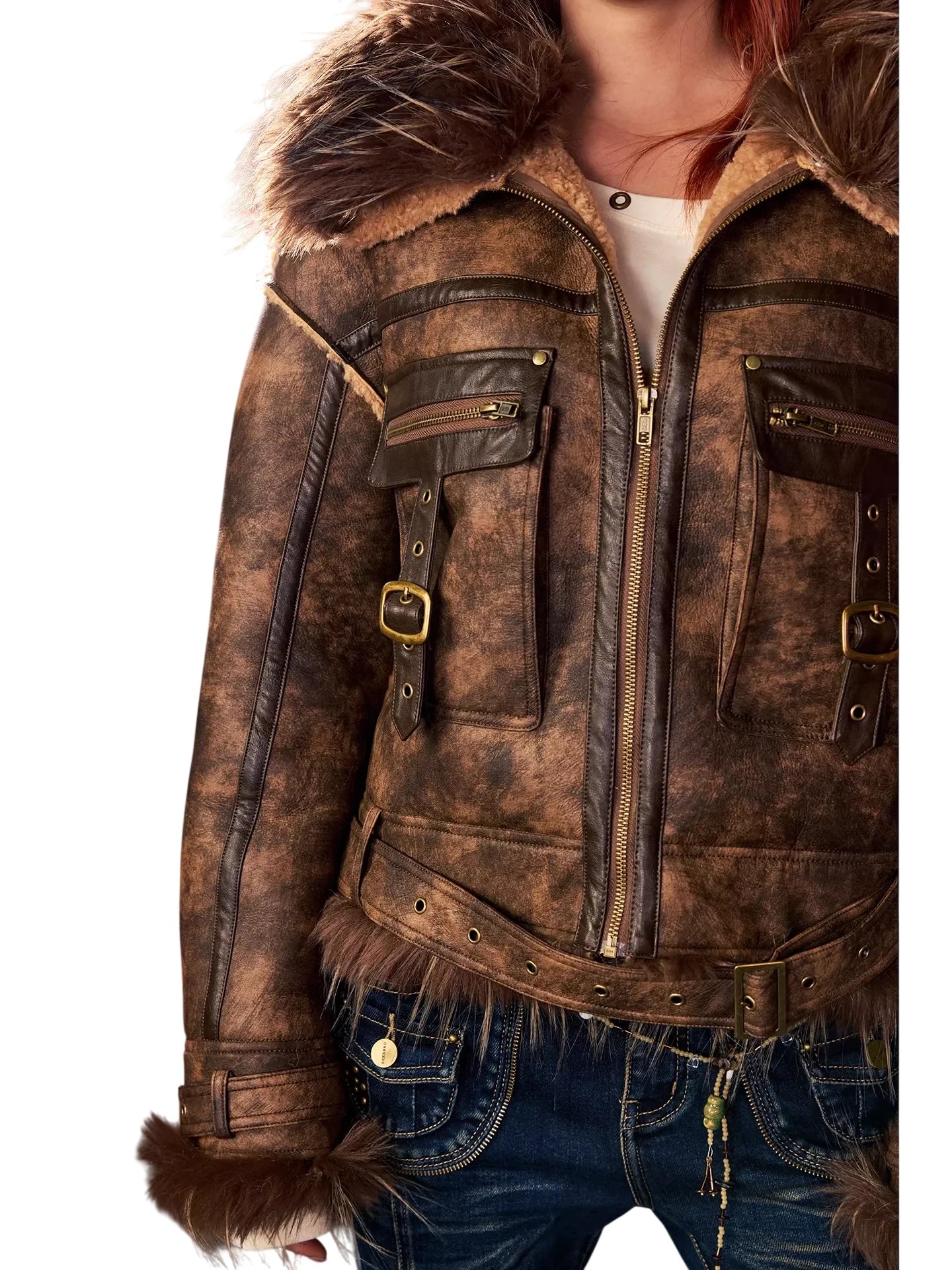 Elevate your winter wardrobe with this stylish faux leather jacket, designed for both warmth and flair. Featuring a unique tie-dye finish, this heavyweight piece is lined with thick shearling for added insulation. Details such as fur trim on the collar, cuffs, and hemline combine rugged aesthetics with cozy comfort. Functional front zippers and pockets complete the utility-inspired look, making this jacket a versatile essential for cool-weather fashion.