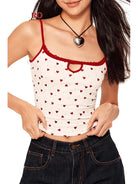 Embrace playful charm this summer with this stylish women’s camisole top. Designed for a slim fit, this sleeveless piece features a vibrant white base adorned with red heart prints, complemented by red piping along the neckline and shoulder straps. The ruched neckline and delicate red bow detail add a feminine touch, making it perfect for casual outings or layering under a light jacket. Pair it with jeans for a chic, effortless look.