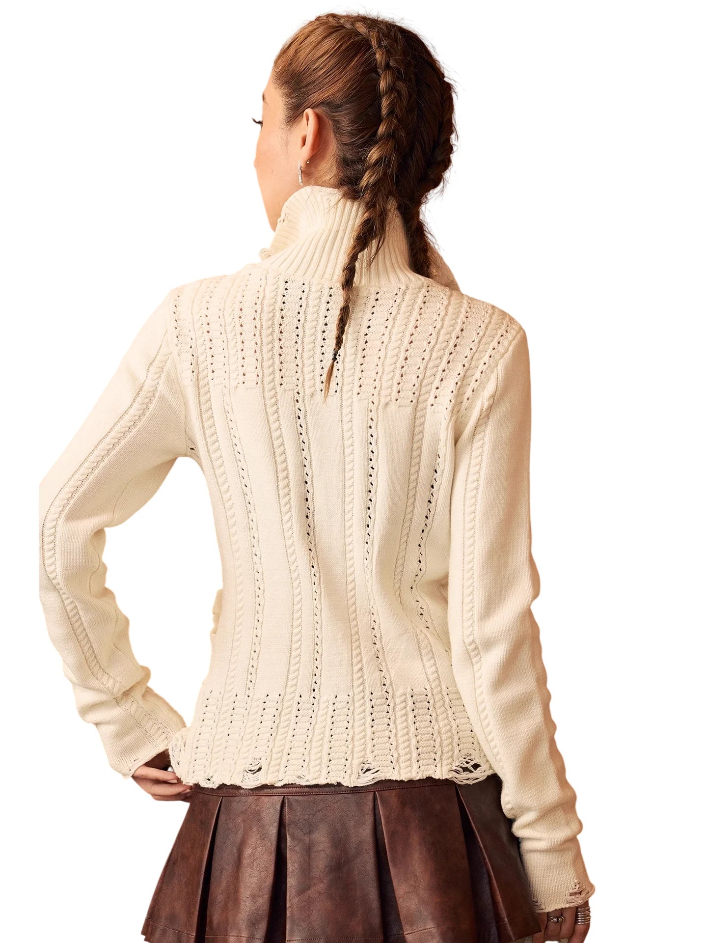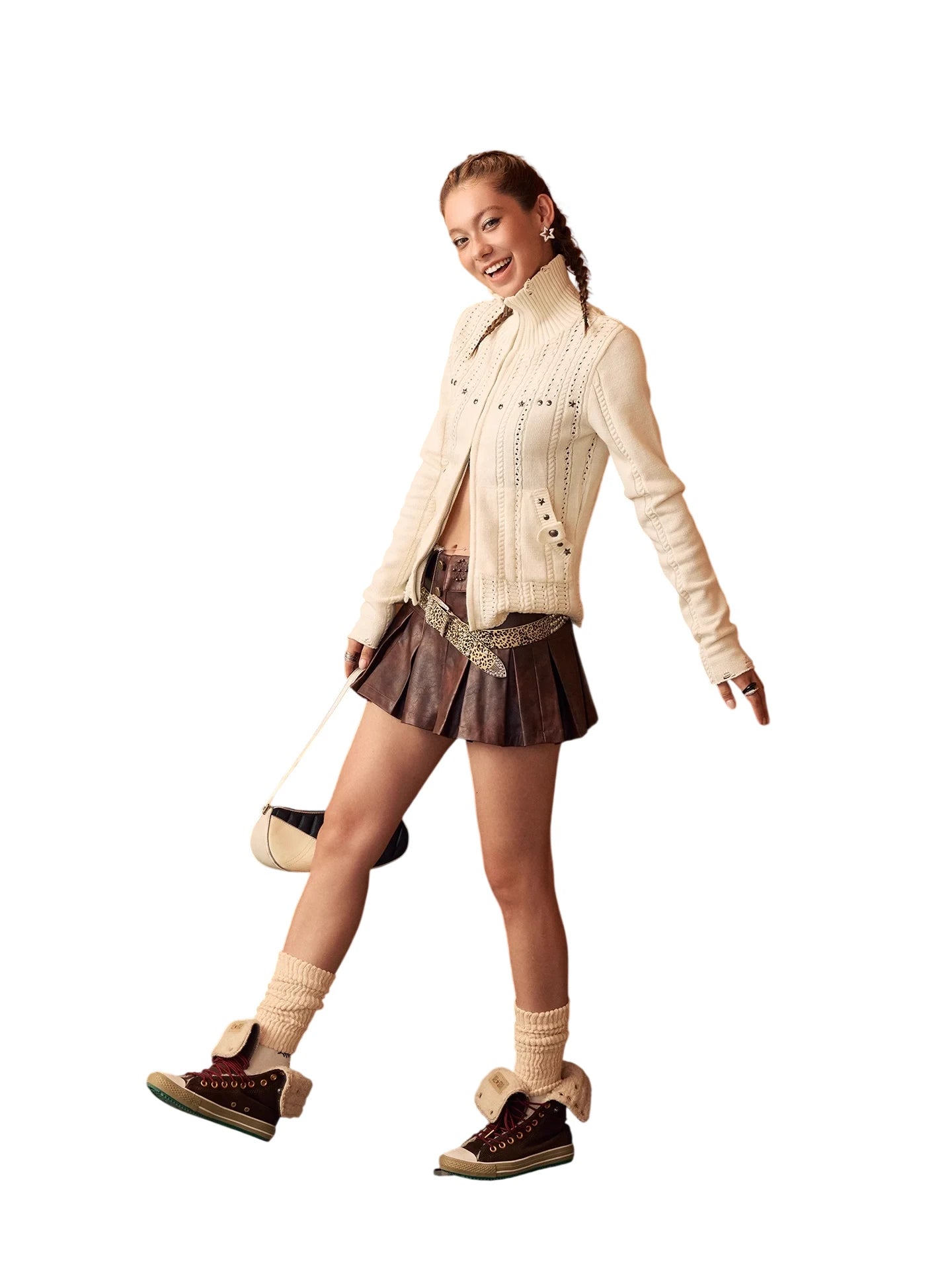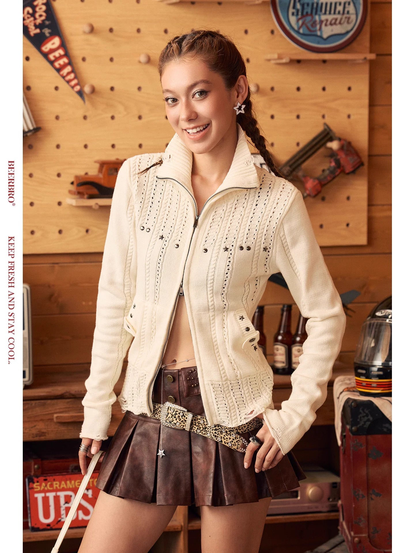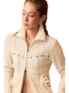 Elevate your style with this women's cable knit cardigan sweater, designed with a slim-fit silhouette and a touch of sparkle. Featuring textured vertical patterns and metallic sequin details, this zip-up jacket blends classic American-style knitwear with modern flair. Two zippered pockets and decorative accents add both function and fashion. Perfect for layering, this sweater pairs effortlessly with skirts or jeans for a cozy-chic look.