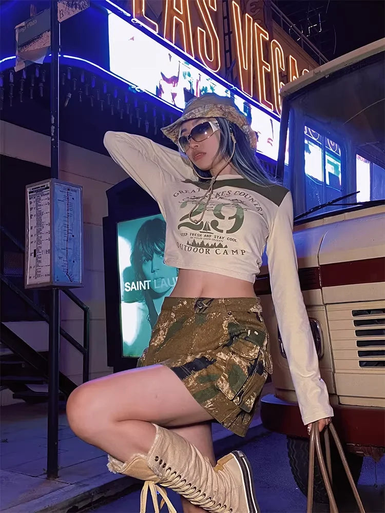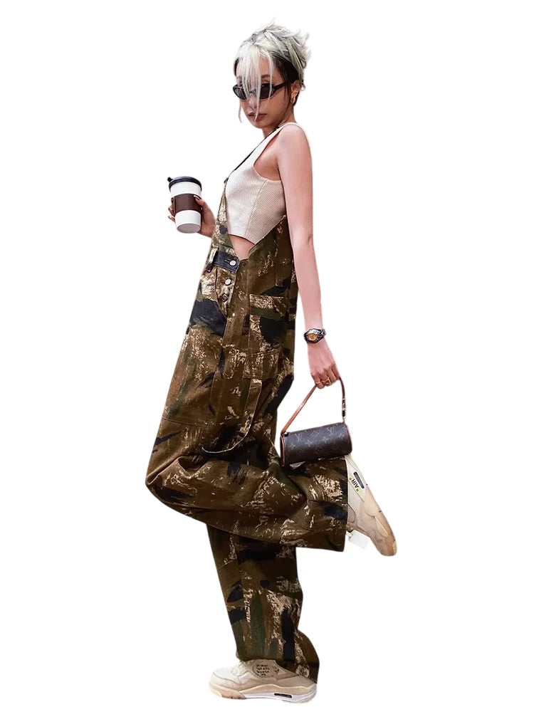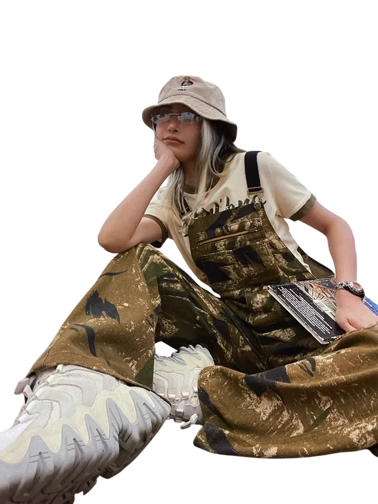 Elevate your street style with these women's high-waisted camouflage overalls, designed with a relaxed, wide-leg silhouette perfect for spring and autumn wear. Featuring an abstract camo pattern in earthy tones and equipped with large side pockets, these cargo pants combine fashion and function effortlessly. Ideal for casual urban outings, the loose fit offers comfort while maintaining a bold, hip-hop-inspired edge.