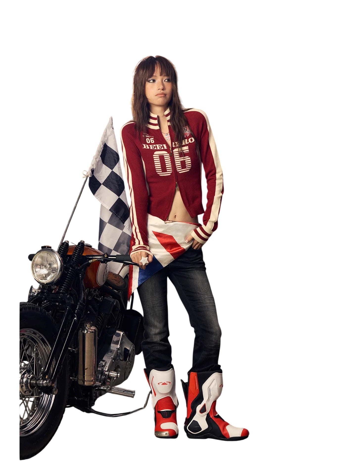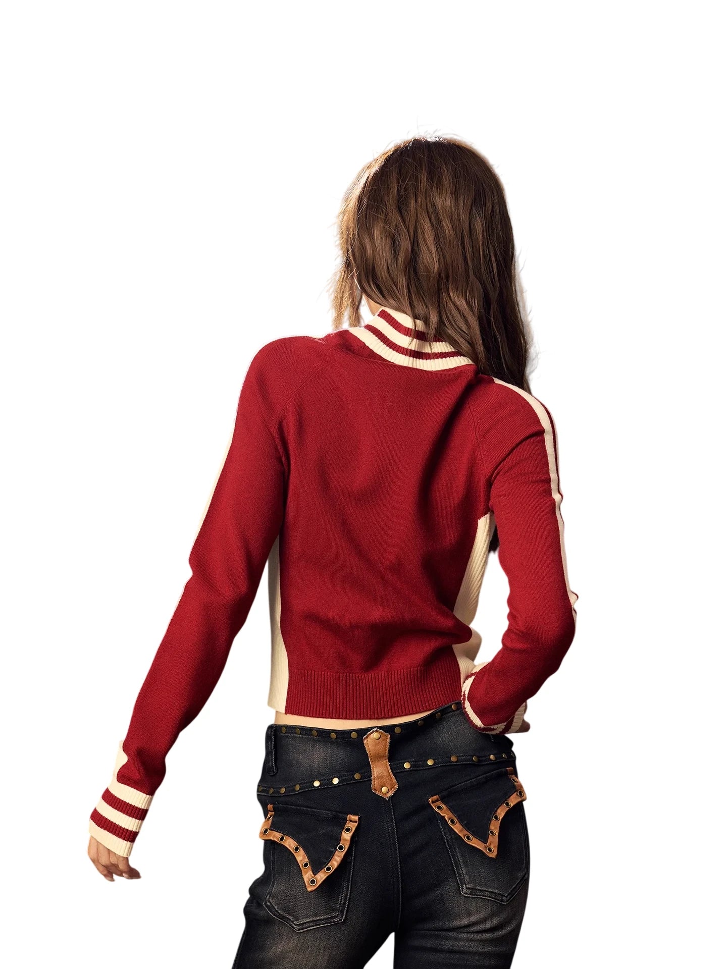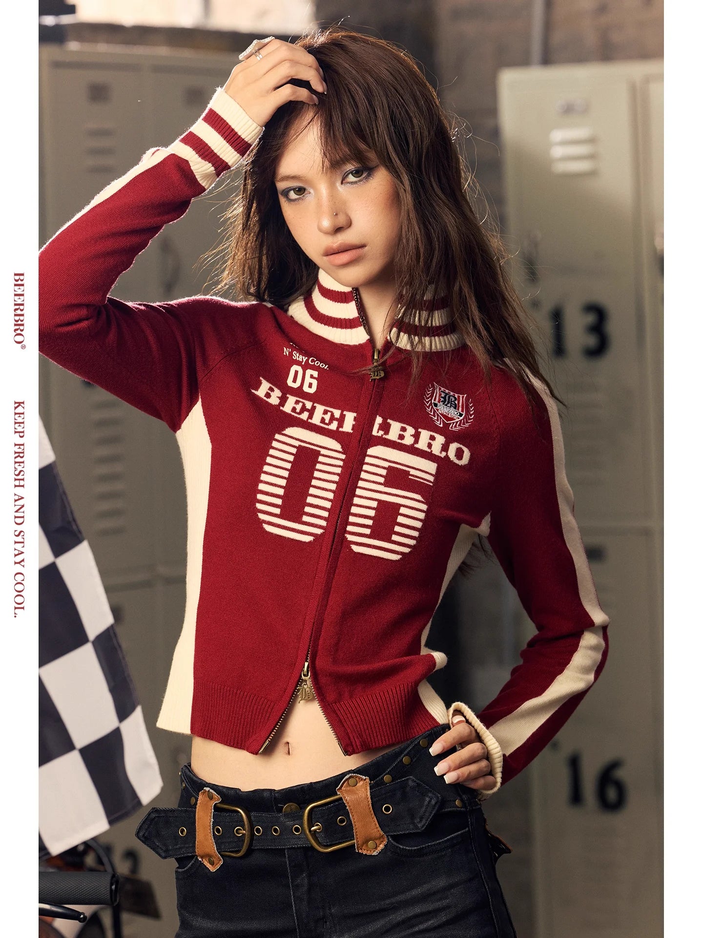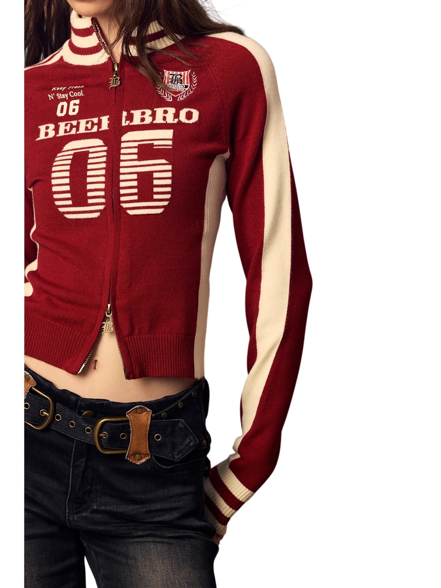 Elevate your autumn and winter wardrobe with this sporty, slim-fit knit zip jacket for women. Featuring a deep red base with contrasting cream accents along the sides and sleeves, this turtleneck-style short jacket boasts a bold varsity-inspired design. Detailed with a large '06' graphic on the chest, a ribbed collar, cuffs, and hem with striped patterns, and a crest-style patch on the left chest, this jacket blends athletic flair with casual comfort. Perfect for layering in cooler weather and adding a retro touch to your everyday look.