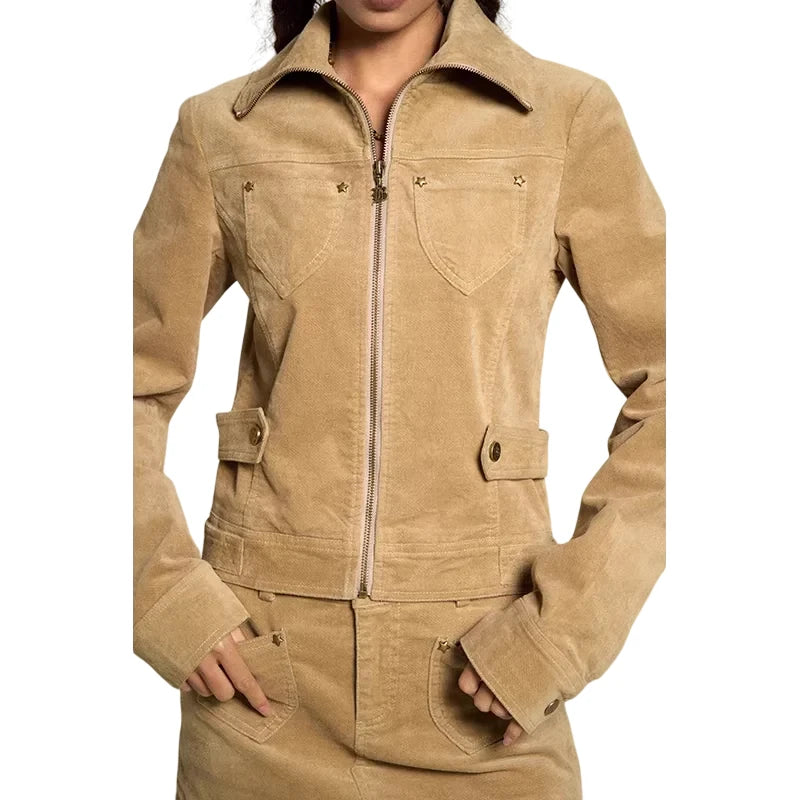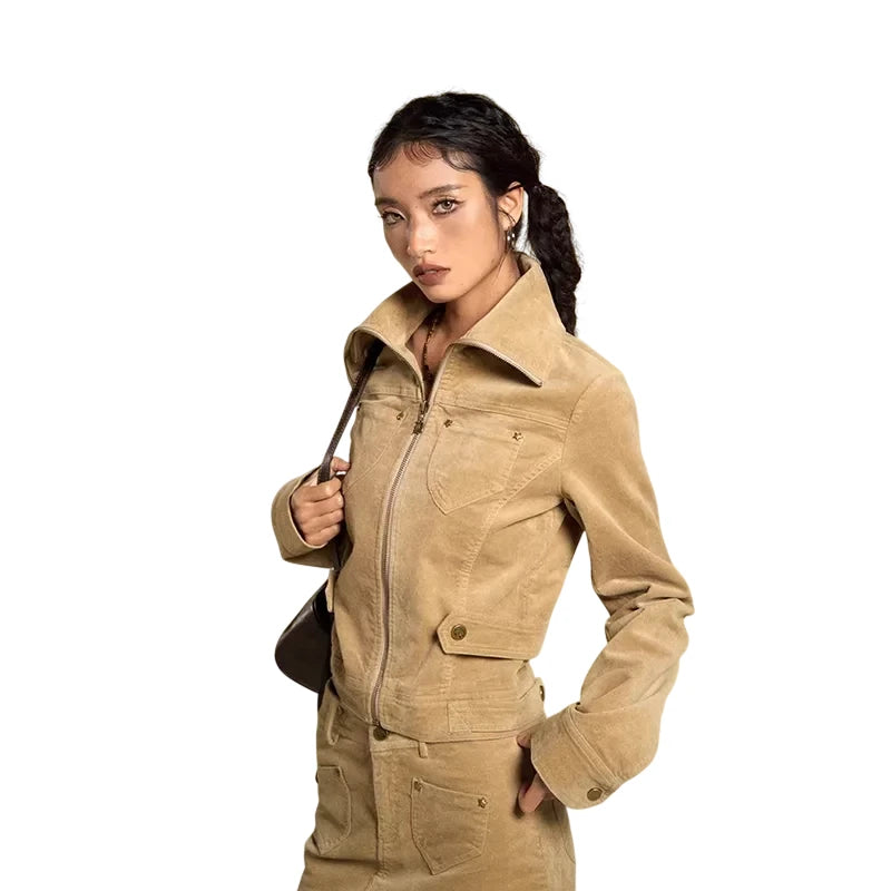 Elevate your autumn and winter wardrobe with this stylish two-piece set for women, featuring a fitted corduroy jacket and matching high-waisted mini skirt. The zip-up jacket includes a classic collar, decorative flap chest pockets, and buttoned cuffs for a polished look. The coordinated skirt is designed with front patch pockets and belt loops, creating a sleek, bodycon silhouette. Perfect for casual and trendy ensembles, this outfit combines both comfort and fashion in a warm tan hue.