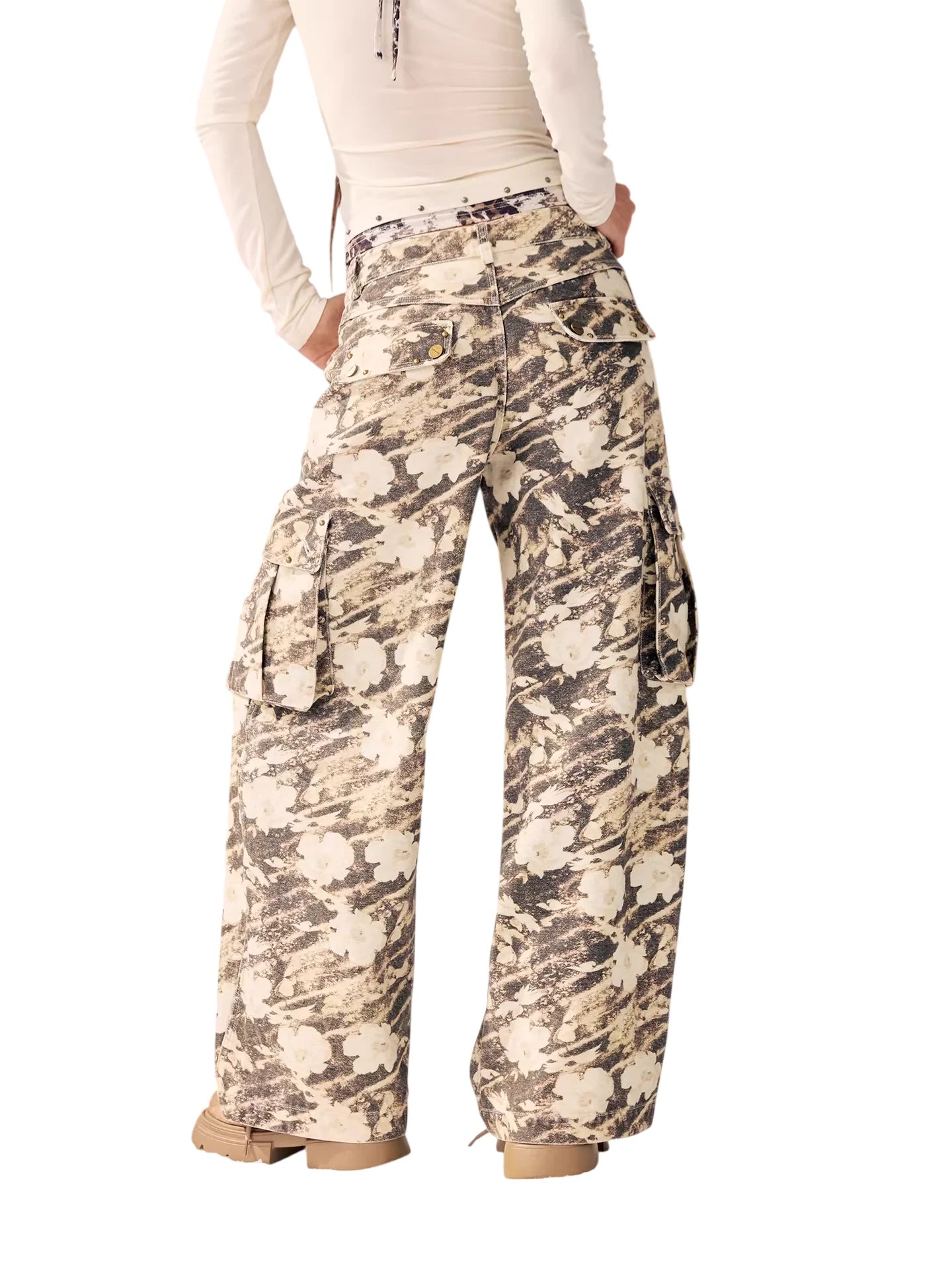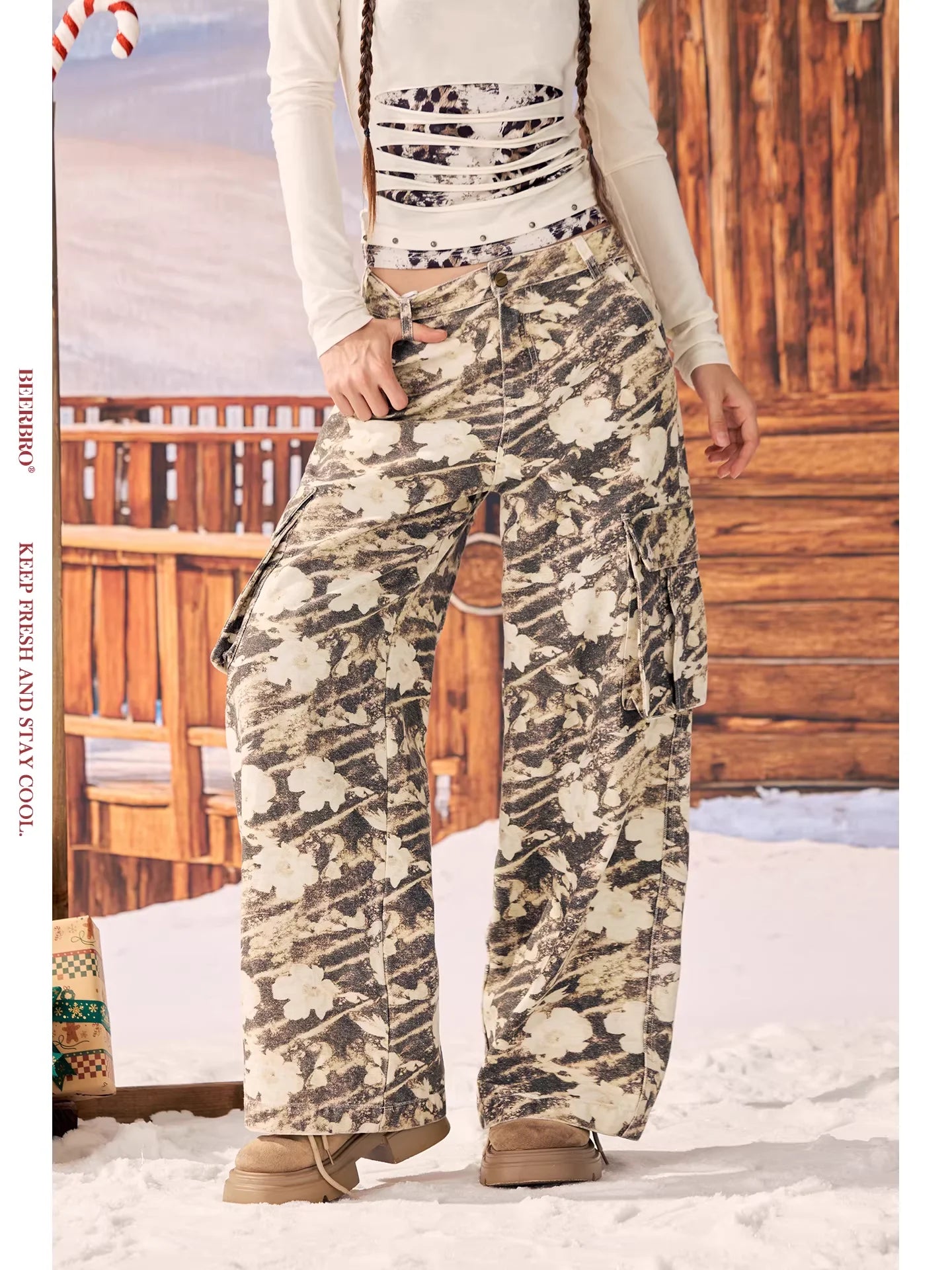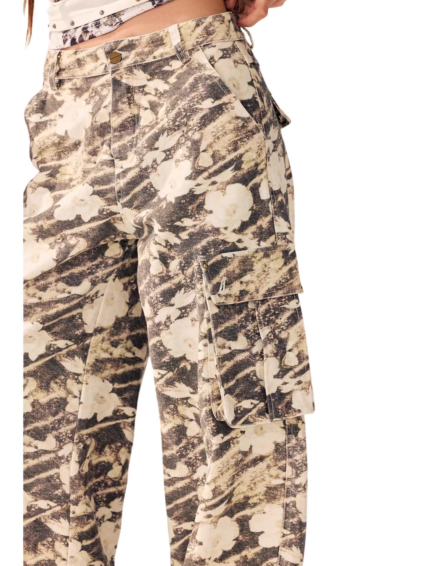 These women's cargo pants feature a 100% cotton construction and a garment-washed finish for a soft, worn-in feel. Designed with a relaxed, wide-leg silhouette and an American-style floral camouflage print in beige and brown tones, these pants offer both comfort and utility. Multiple pockets, including flap cargo pockets, enhance the classic utilitarian look. Ideal for casual wear in cooler weather.