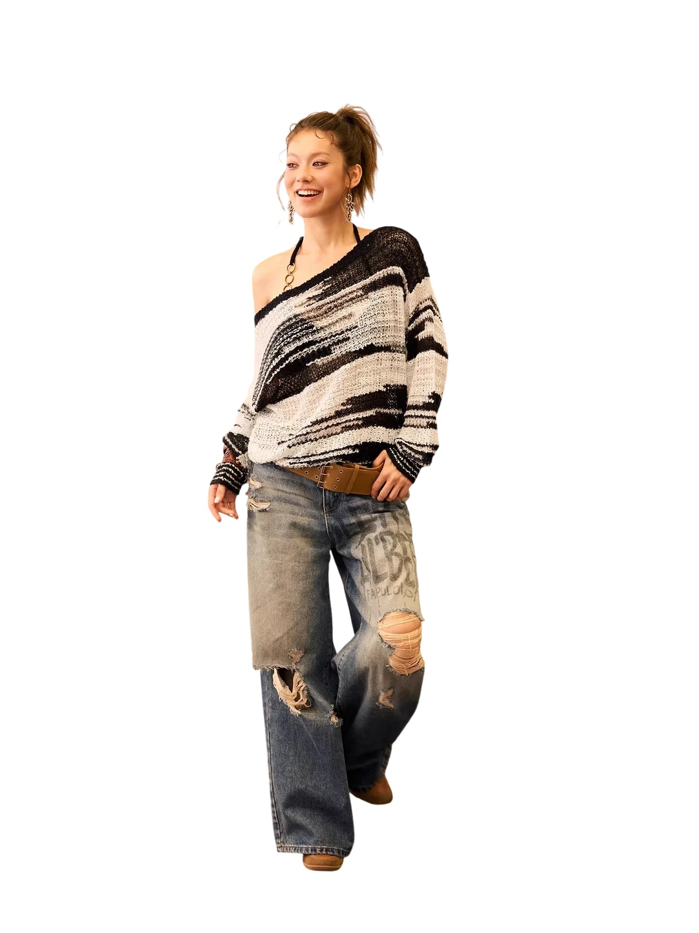 Elevate your casual wardrobe with these stylish women's high-waisted jeans. Featuring a straight leg cut and a relaxed, loose fit, these jeans are designed for both comfort and edge. The washed denim is heavily distressed with bold rips throughout the legs, adding a trendy, lived-in look. A unique printed text detail on the right thigh reads "KEEP FRESH FABULOUS," bringing a fashionable statement to your outfit. Finished with a classic button and zip closure, these jeans are perfect for creating standout streetwear-inspired ensembles.
