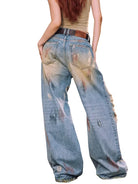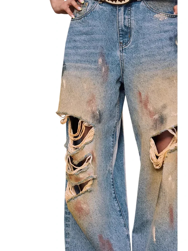 Elevate your autumn wardrobe with these stylish women's distressed jeans featuring a loose, straight-leg silhouette and a trendy floor-length fit. Designed with a draped effect and prominent ripped detailing on the thighs and knees, these jeans offer a bold, street-inspired look. The heavily washed denim and bleach accents add to the edgy aesthetic — perfect for casual outings and everyday wear.