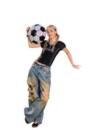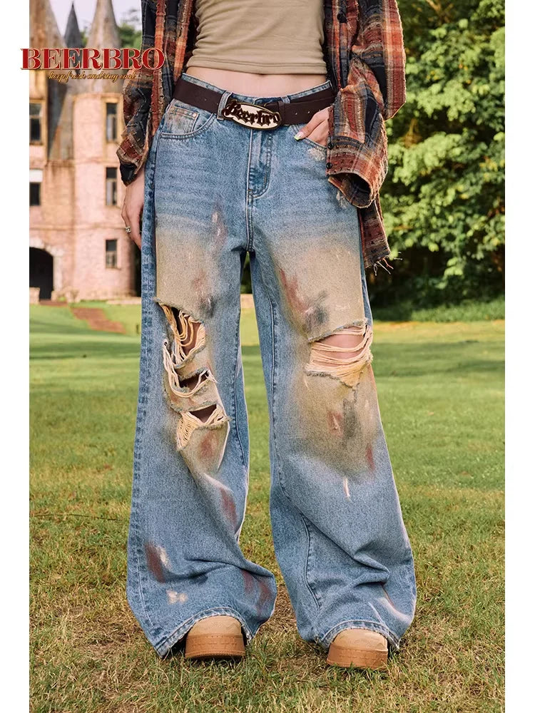 BeerBro Women's Distressed Loose Straight-Leg Jeans with Floor-Length Design