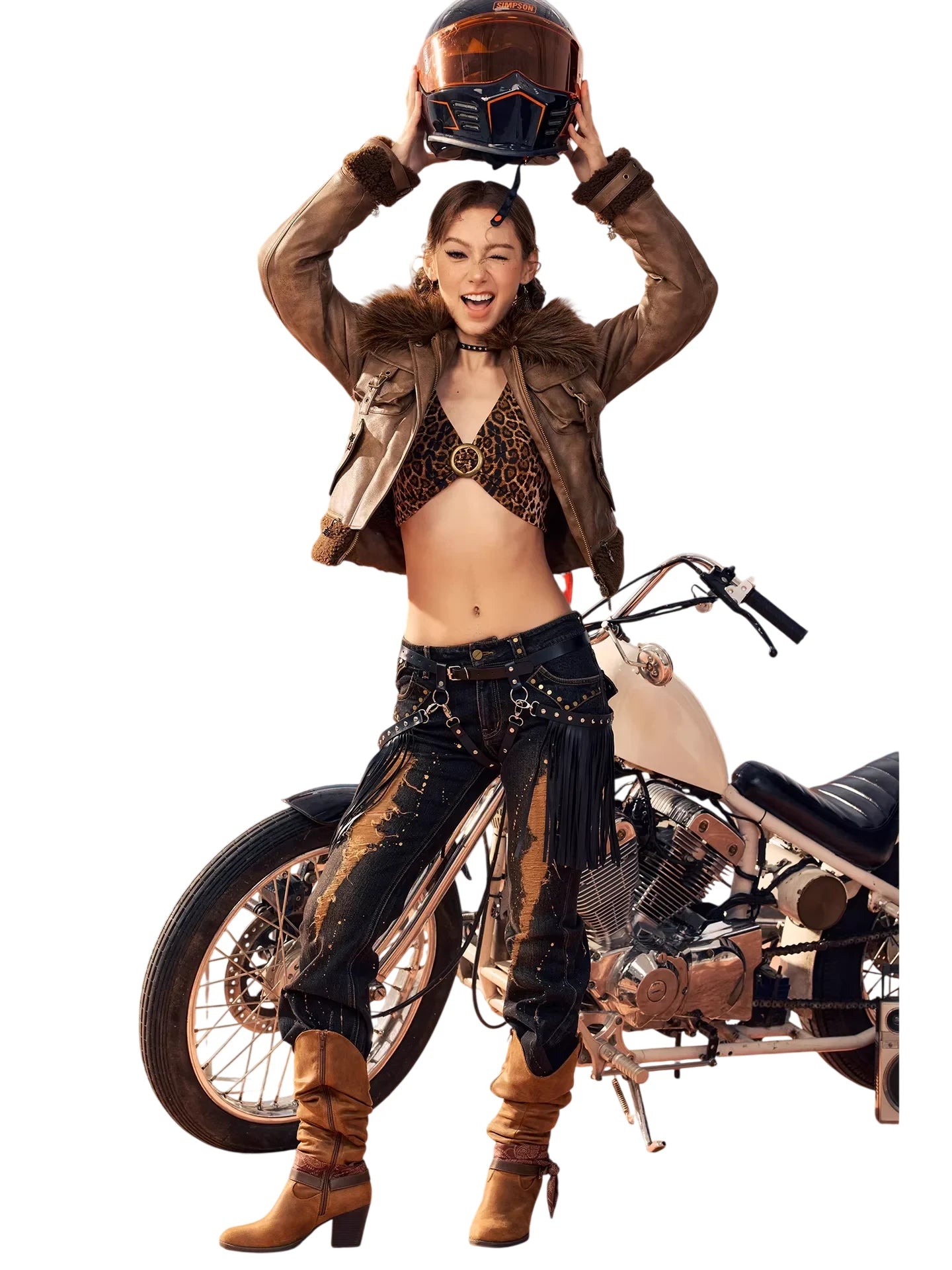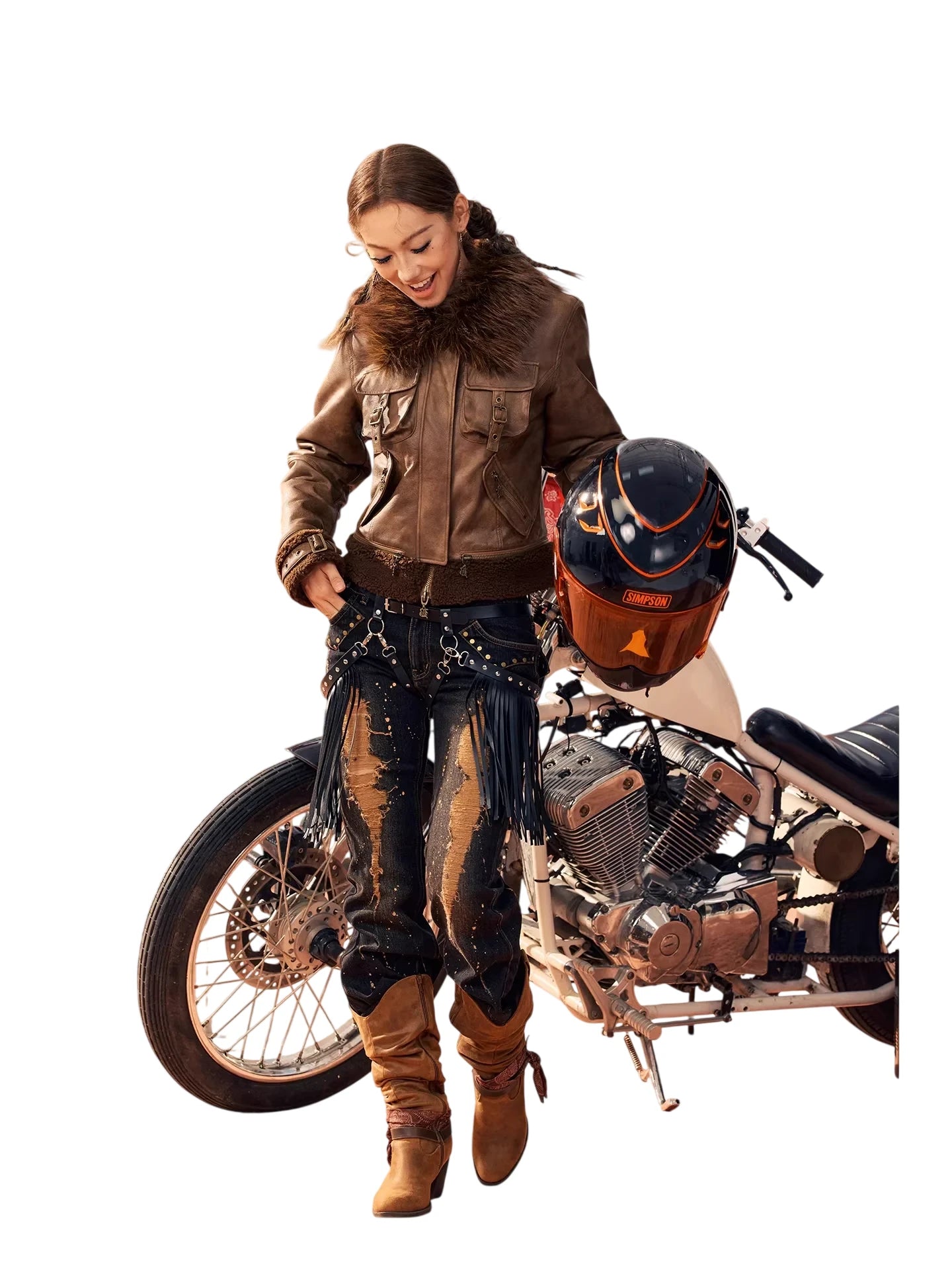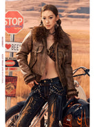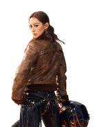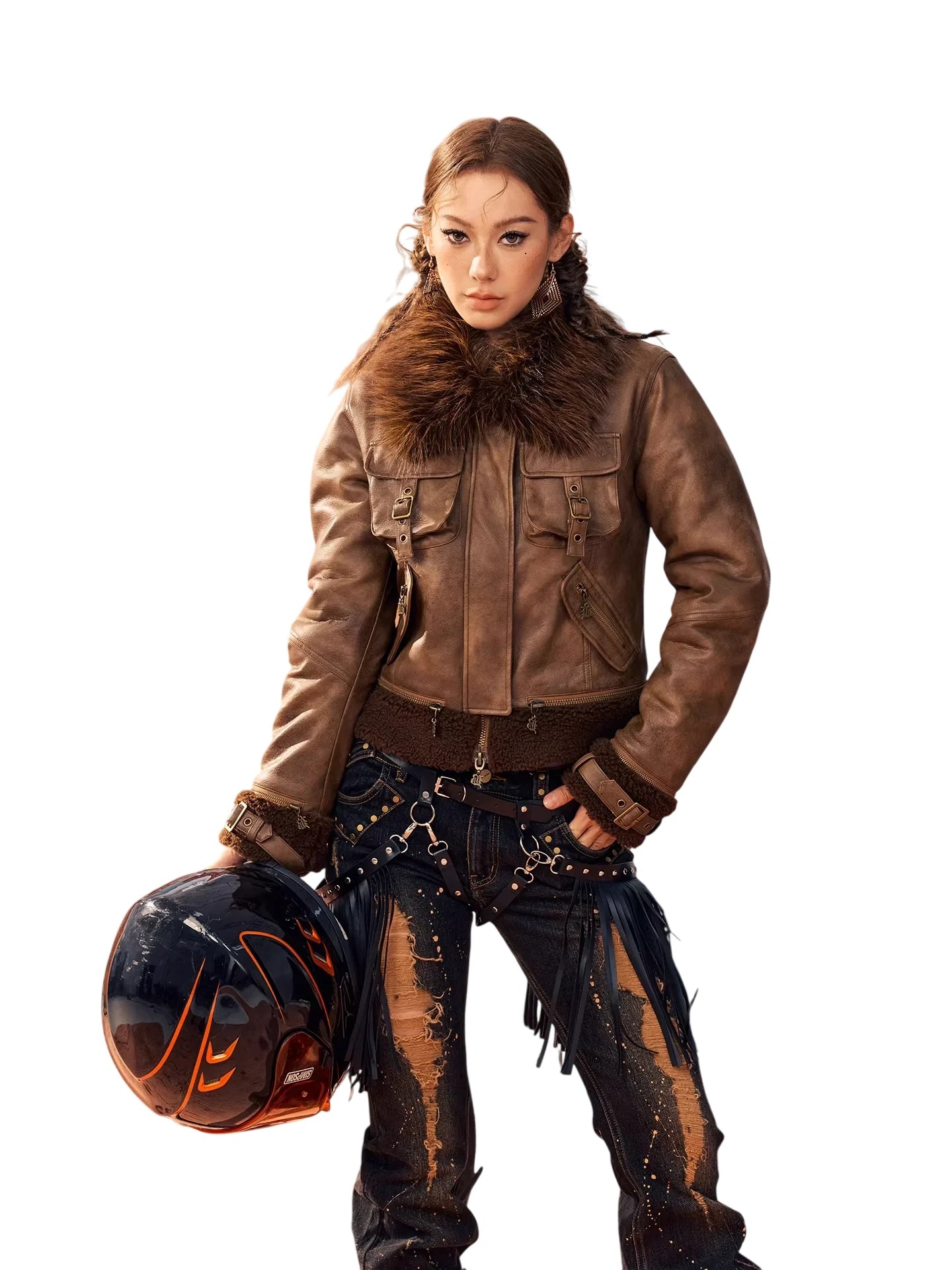 Elevate your outerwear with this stylish women's shearling jacket, designed with a slightly loose fit for comfort and ease. Featuring a spliced faux fur and leather design, it offers a rugged look with vintage appeal. The large fur collar and multiple pocket details add both function and flair, while its short length makes it ideal for layering over your favorite outfits. Perfect for capturing a chic, adventurous aesthetic.