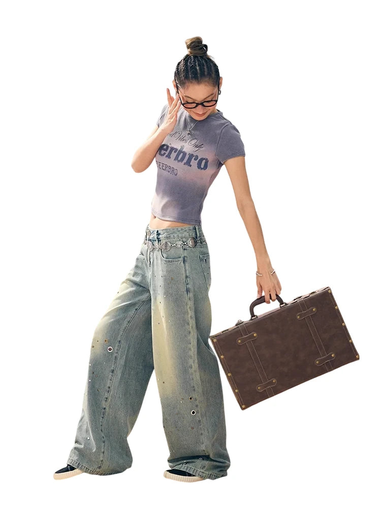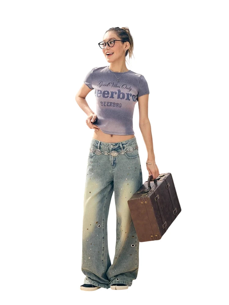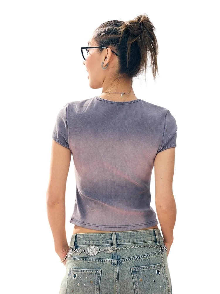 Elevate your summer wardrobe with this stylish women's slim fit T-shirt. Featuring short sleeves and a ribbed texture, this top comes in a soft, gradient faded finish with subtle rhinestone accents. The front is adorned with playful text details, adding a casual and youthful touch. Perfect for pairing with jeans or shorts, this T-shirt brings effortless charm to any sunny day look.
