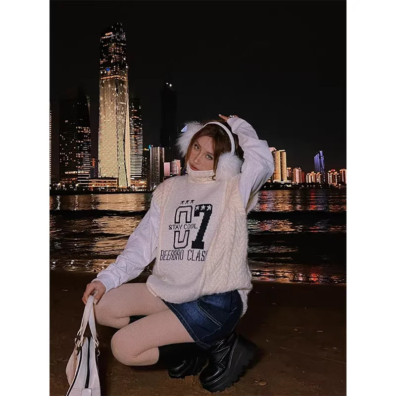 BeerBro Women's High Neck Knitted Vest - Sleeveless, Loose Fit, Autumn Winter Style