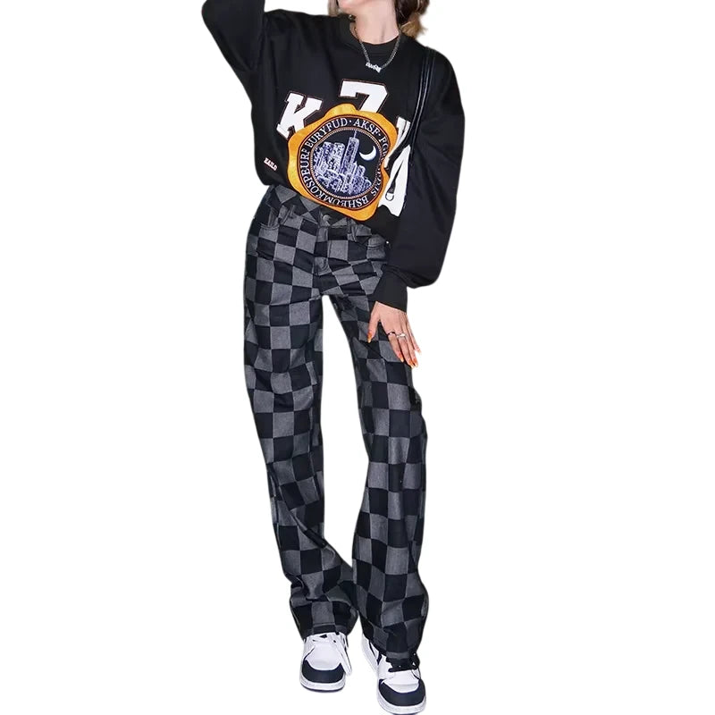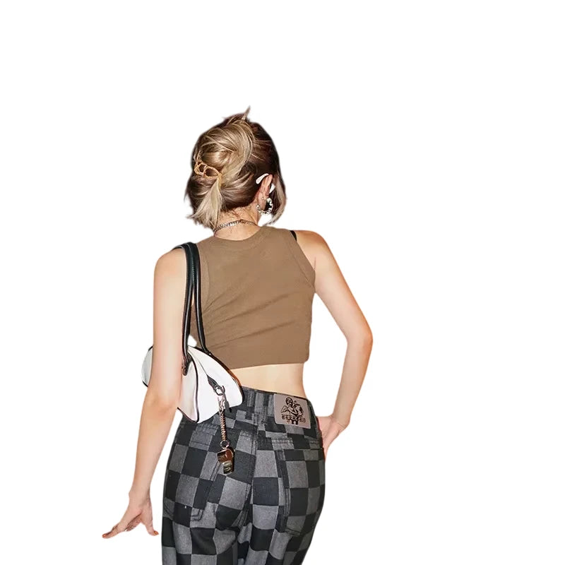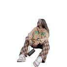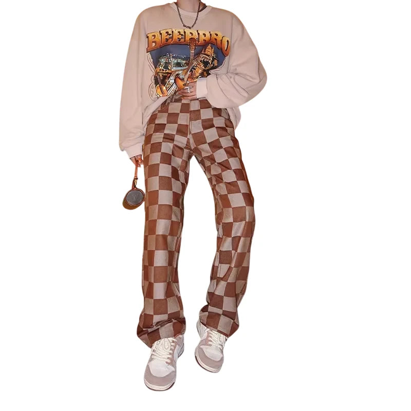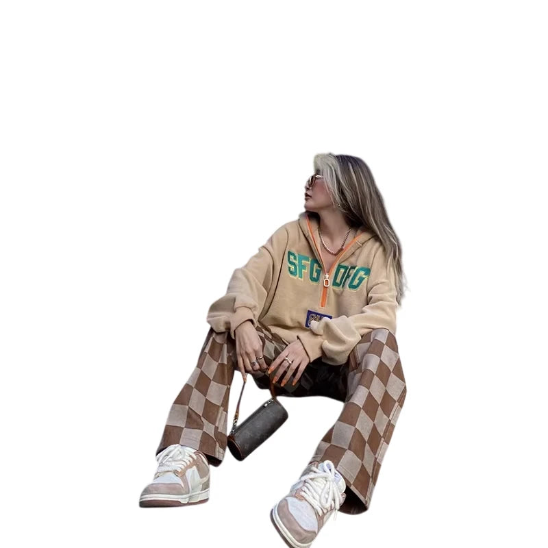 Elevate your casual style with these women's high-waisted checkered pants, perfect for autumn and winter wear. Featuring a wide-leg silhouette in a classic brown and beige color palette, these trousers combine retro American streetwear vibes with modern comfort. Designed for a relaxed fit, they pair effortlessly with hoodies, crop tops, and casual sneakers for an easy yet fashionable look. Ideal for outdoor strolls or laid-back days, these versatile pants are a must-have for your seasonal wardrobe.