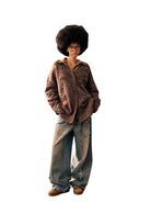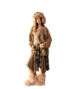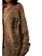 Stay cozy and stylish during the colder months with this oversized wool cardigan for women. Featuring a rustic aesthetic, this button-down sweater is crafted from a warm, knitted fabric in a brownish-grey tone. Design highlights include a unique leopard-print chest pocket, decorative patches, and intentional distressed detailing for a vintage-inspired street style look. Perfect for autumn and winter wear, the relaxed fit offers both comfort and effortless charm.