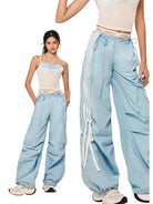 Stay cool and stylish this summer with these women's loose wide-leg cargo pants. Featuring a relaxed fit and floor-length design, these trousers offer both comfort and a contemporary look. The pants are detailed with white vertical stripes down the sides, drawstring ties at the waistband and ankles for an adjustable fit, and practical side pockets. Perfect for casual wear or sporty outings, these pants blend retro flair with modern utility.