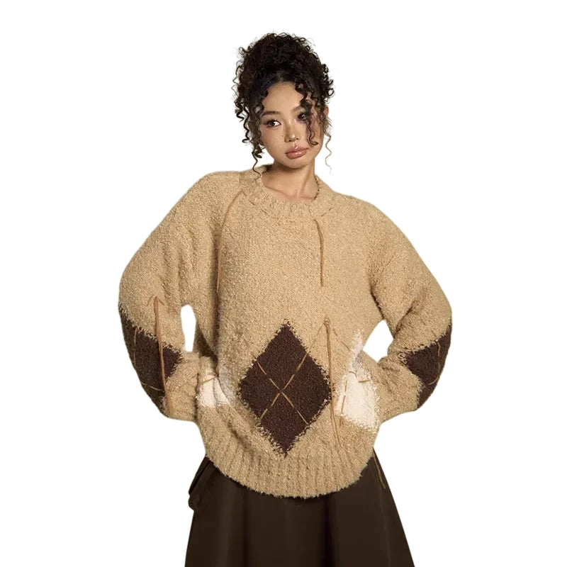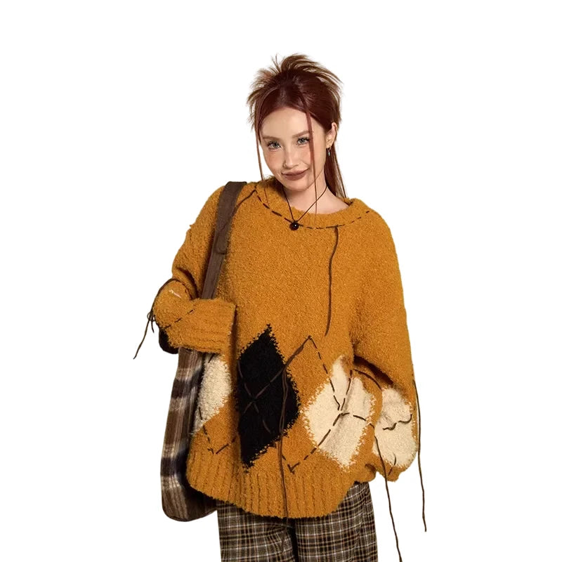 Elevate your cold-weather style with this women's oversized argyle sweater, inspired by American retro fashion. Featuring bold diamond patterns and a textured patchwork design, this knitwear adds a unique, handmade aesthetic to any autumn or winter wardrobe.