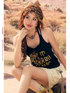 Elevate your summer wardrobe with this women's padded slim fit camisole, designed for both comfort and style. Featuring a sleeveless, halter-neck cut, this top includes bold distressed lettering with a glitter logo that adds an edgy, urban vibe. Perfect for pairing with casual bottoms like shorts or jeans, this camisole is ideal for warm weather outings.