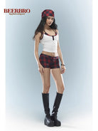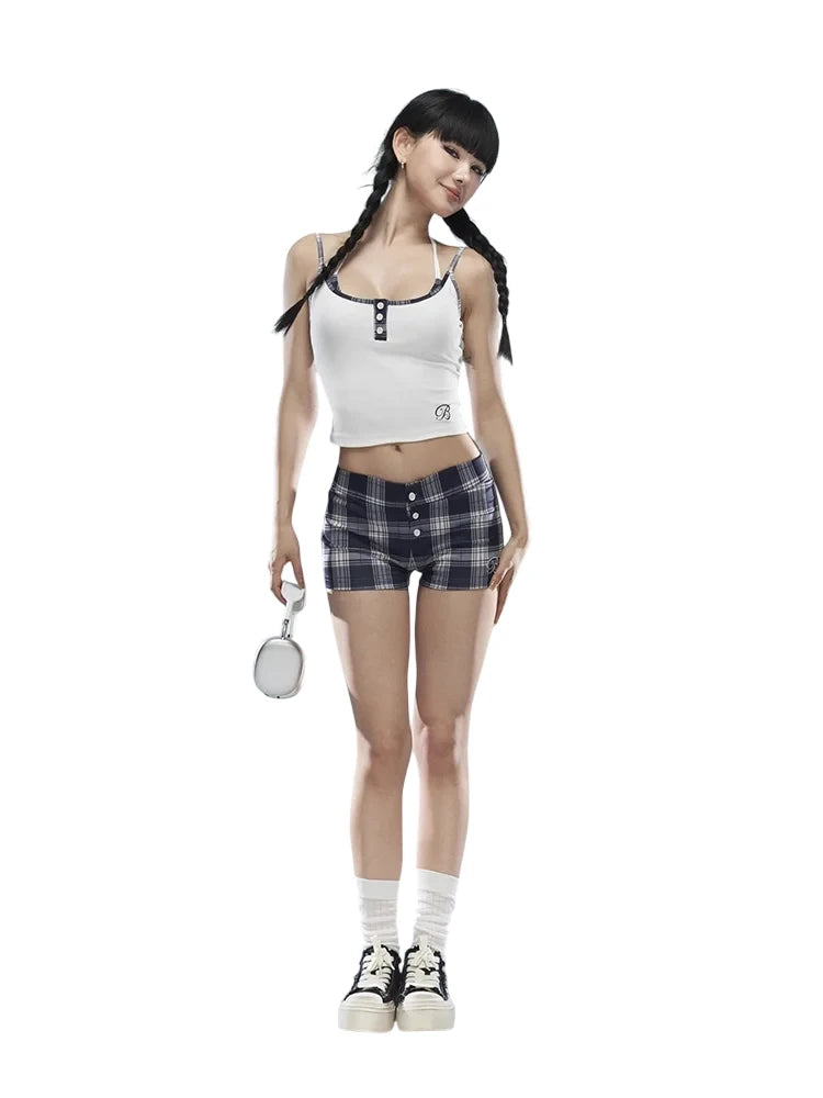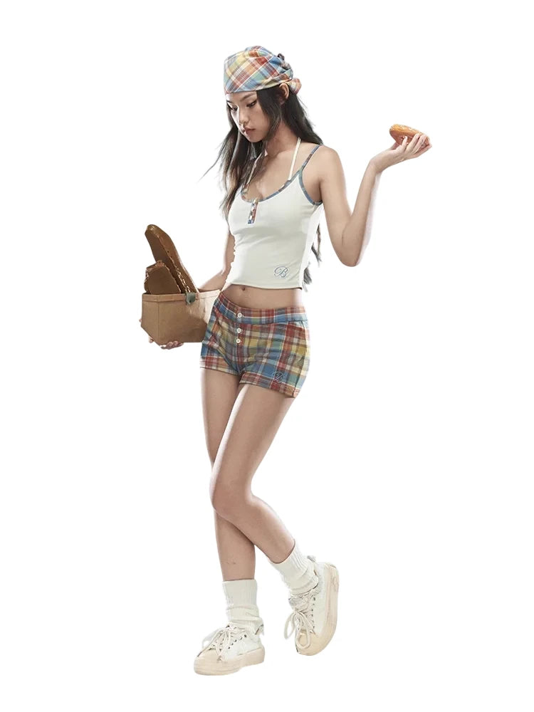 This stylish three-piece outfit for women includes a sleek, sleeveless crop top with plaid trim and front button detailing, paired with matching plaid hot shorts for a cohesive summer look. Completing the ensemble is a coordinating plaid headscarf, making it perfect for casual outings or playful, themed events. Comfortable and fashionable, this set combines classic patterns with contemporary design.