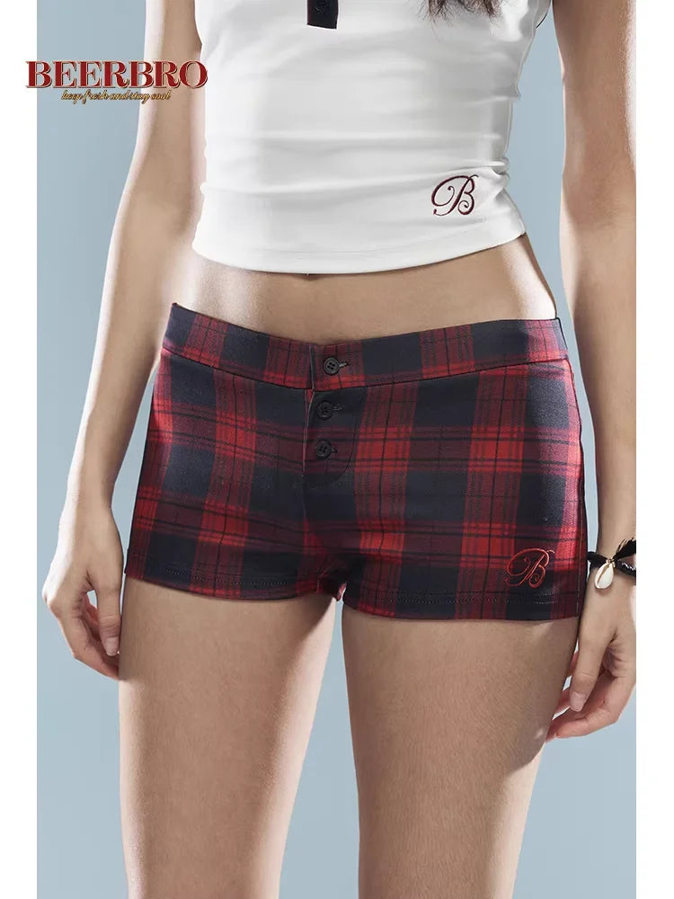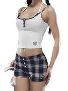 This stylish three-piece summer set for women features a colorful plaid design with a coordinated camisole, fitted shorts, and a matching vest. The low-rise shorts offer a flattering fit with a front button placket and breathable fabric, ideal for casual or lounge wear. The cropped camisole and vest complete the laid-back yet fashionable ensemble, perfect for warm-weather days.