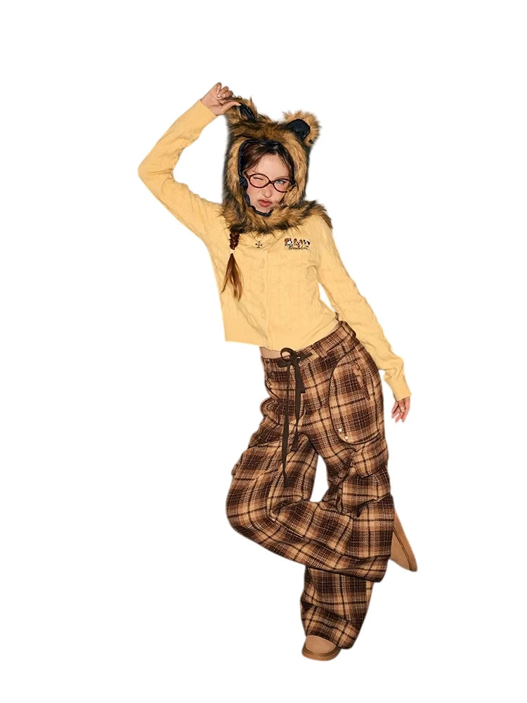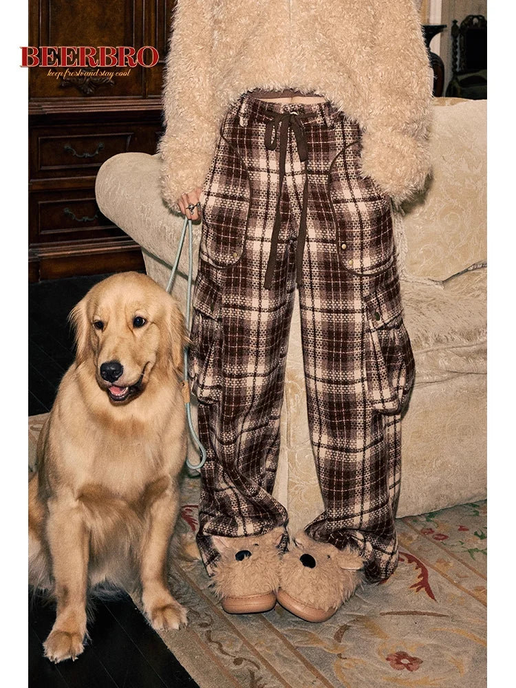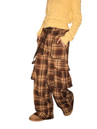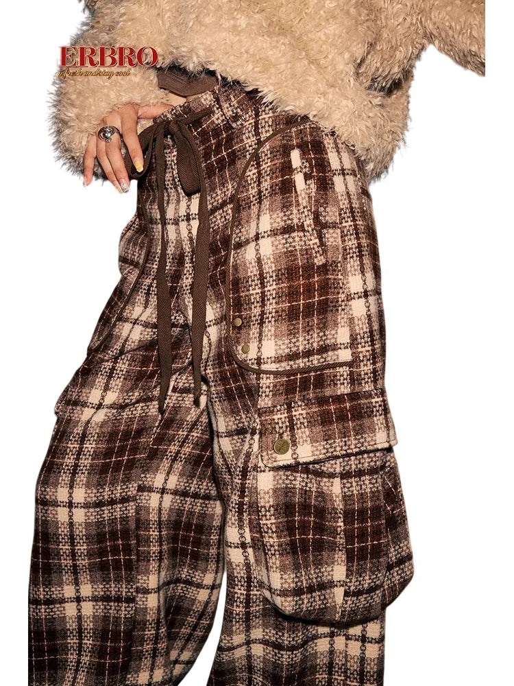 Stay cozy and stylish during the colder months with these women's plaid tweed work pants. Designed in a relaxed wide-leg silhouette, these trousers feature a classic brown and beige plaid pattern, drawstring waistband, and multiple pockets for added functionality. Made from a soft, warm fabric, they're perfect for both casual outings and lounging indoors during autumn and winter.