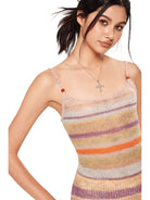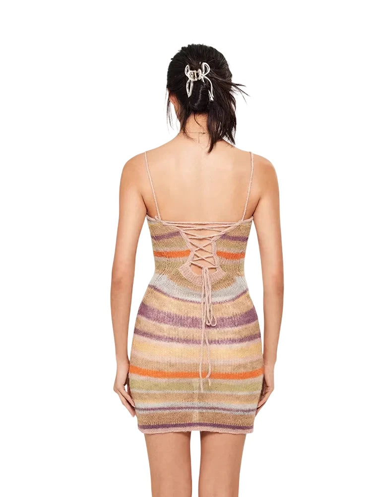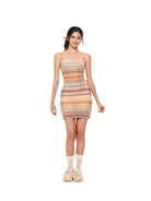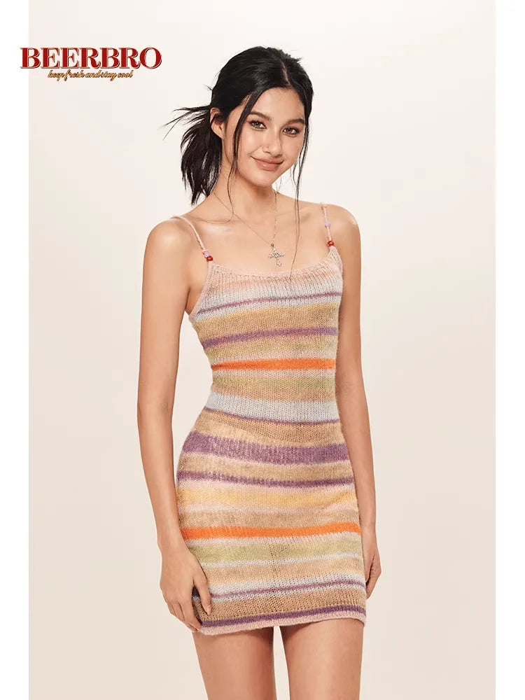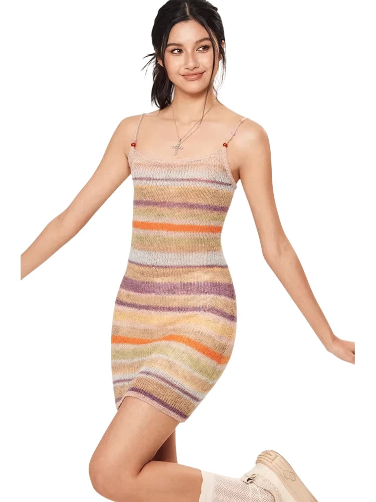 Embrace a stylish summer look with this sleeveless knit bodycon dress designed for women. Featuring a vibrant rainbow-striped pattern in muted shades of purple, orange, beige, and olive green, this slim-fit dress offers a flattering silhouette with thin spaghetti straps for a light and airy feel. Perfect for casual outings or warm-weather gatherings, it's a chic addition to any summer wardrobe.