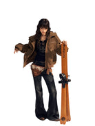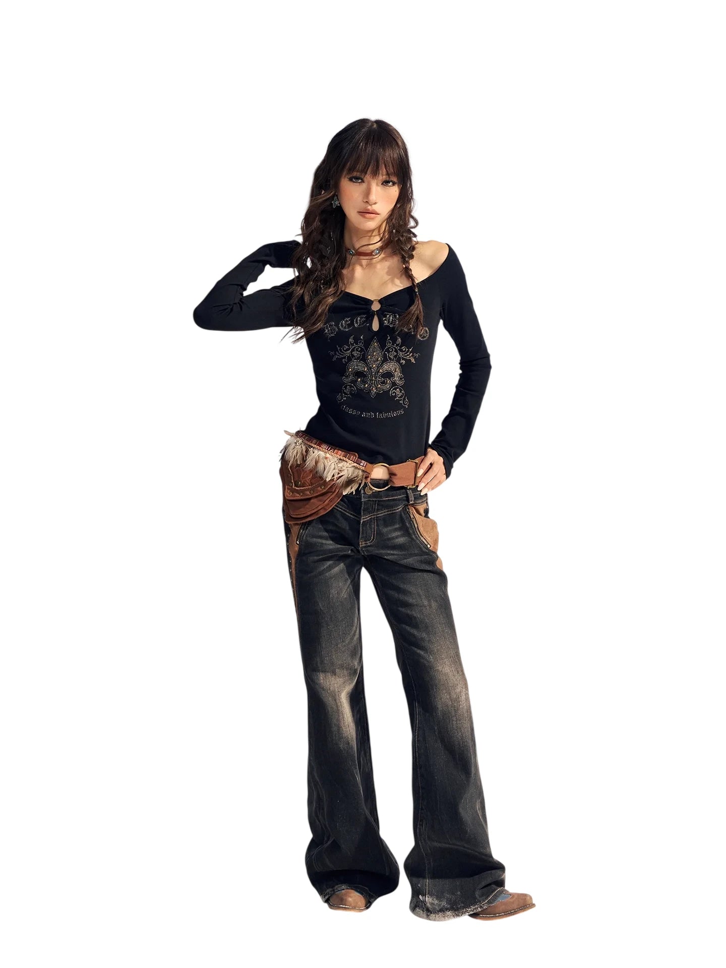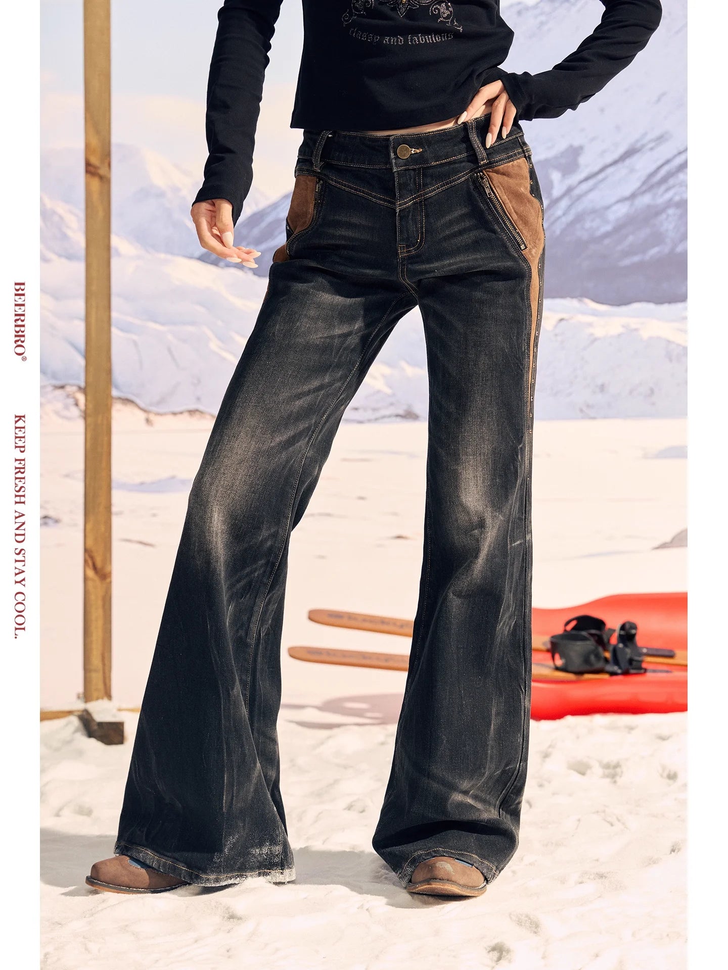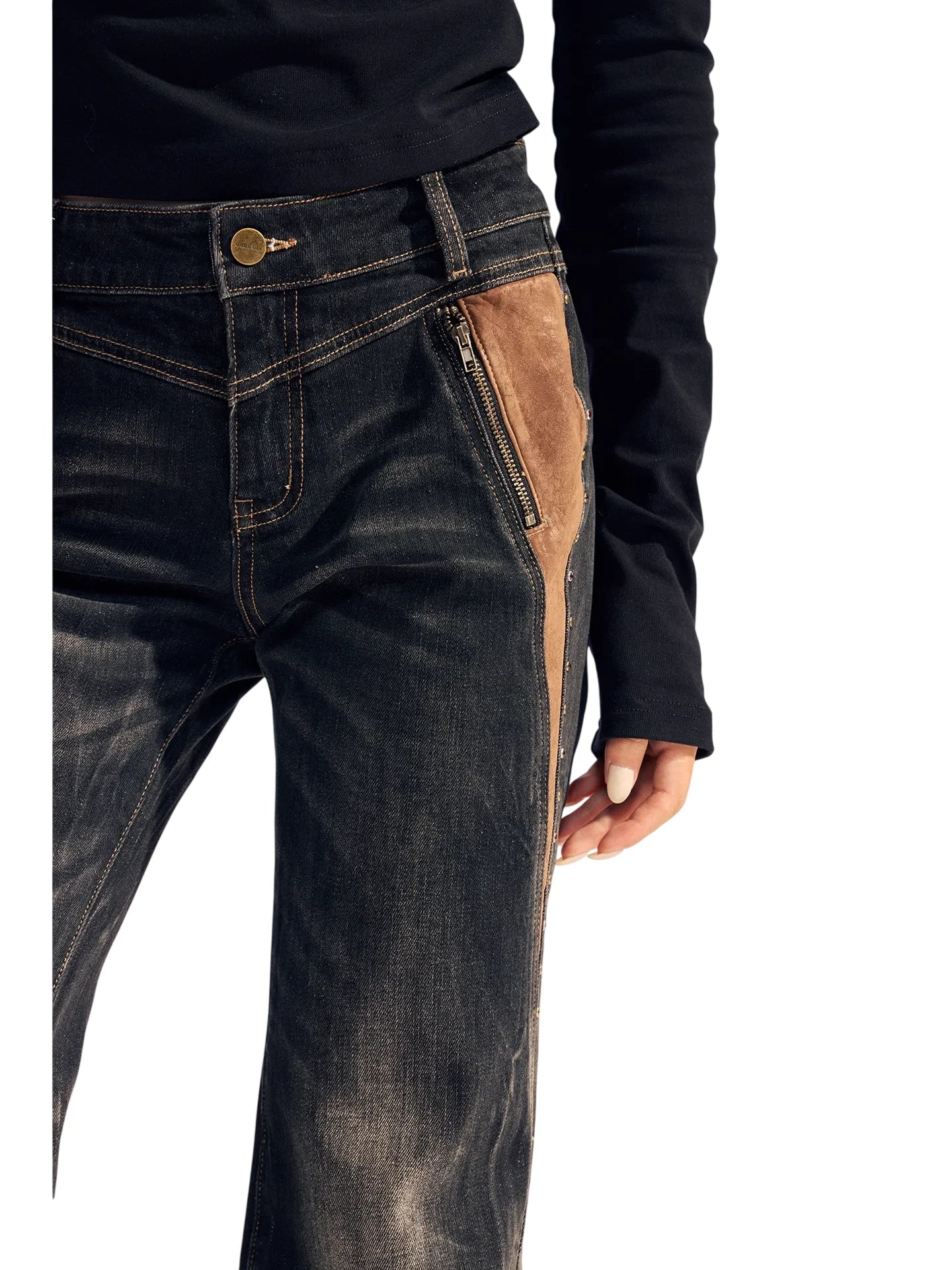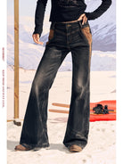 Elevate your winter style with these women's high-waisted flared denim pants, featuring a vintage washed finish and eye-catching suede patchwork. Carefully constructed with stretch fabric for comfort and fit, these jeans are adorned with subtle rhinestone embellishments for a touch of glam. The flared silhouette and bold seam detailing bring back a retro edge, while oversized statement pockets add a practical yet fashionable element. Ideal for colder seasons, these pants pair effortlessly with your favorite fitted tops for a chic, layered look.
