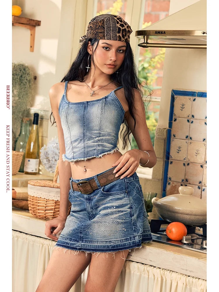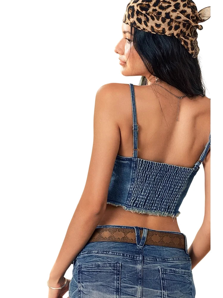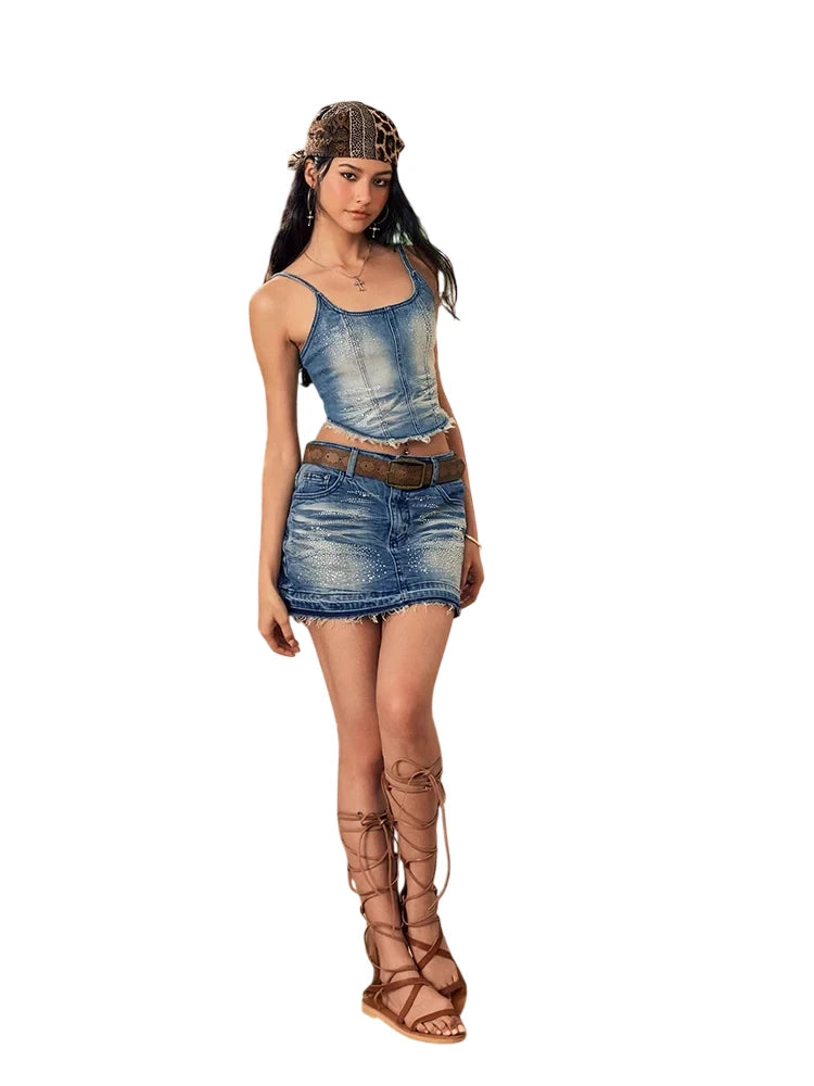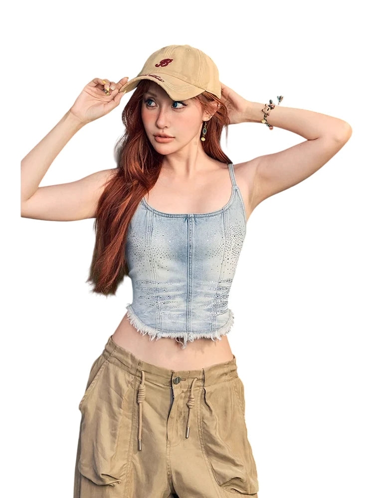 Elevate your summer wardrobe with this stylish women's denim crop top, designed with sparkling rhinestone fringe and delicate spaghetti straps. The structured panel stitching creates a flattering silhouette, while the frayed hem adds a touch of edgy charm. This trendy camisole pairs effortlessly with skirts or shorts for a chic, warm-weather look that's perfect for casual outings or relaxed get-togethers.