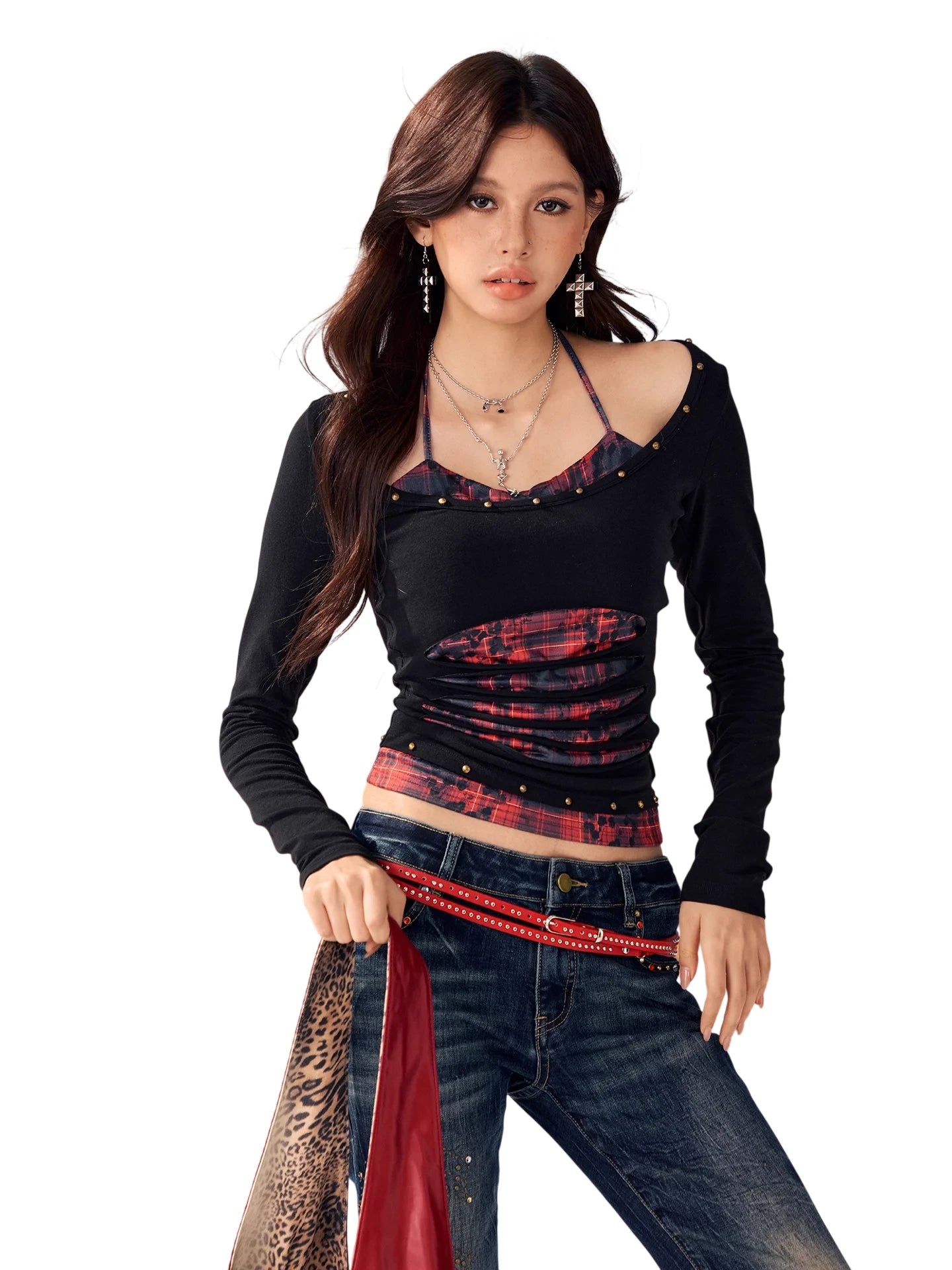 Stay stylish and cozy with this women's slim fit knit top, designed with a trendy faux two-piece look. This long-sleeved top features distressed design elements and decorative bead accents for a touch of unique flair. Ideal for layering or wearing on its own, it's a standout piece for colder weather.