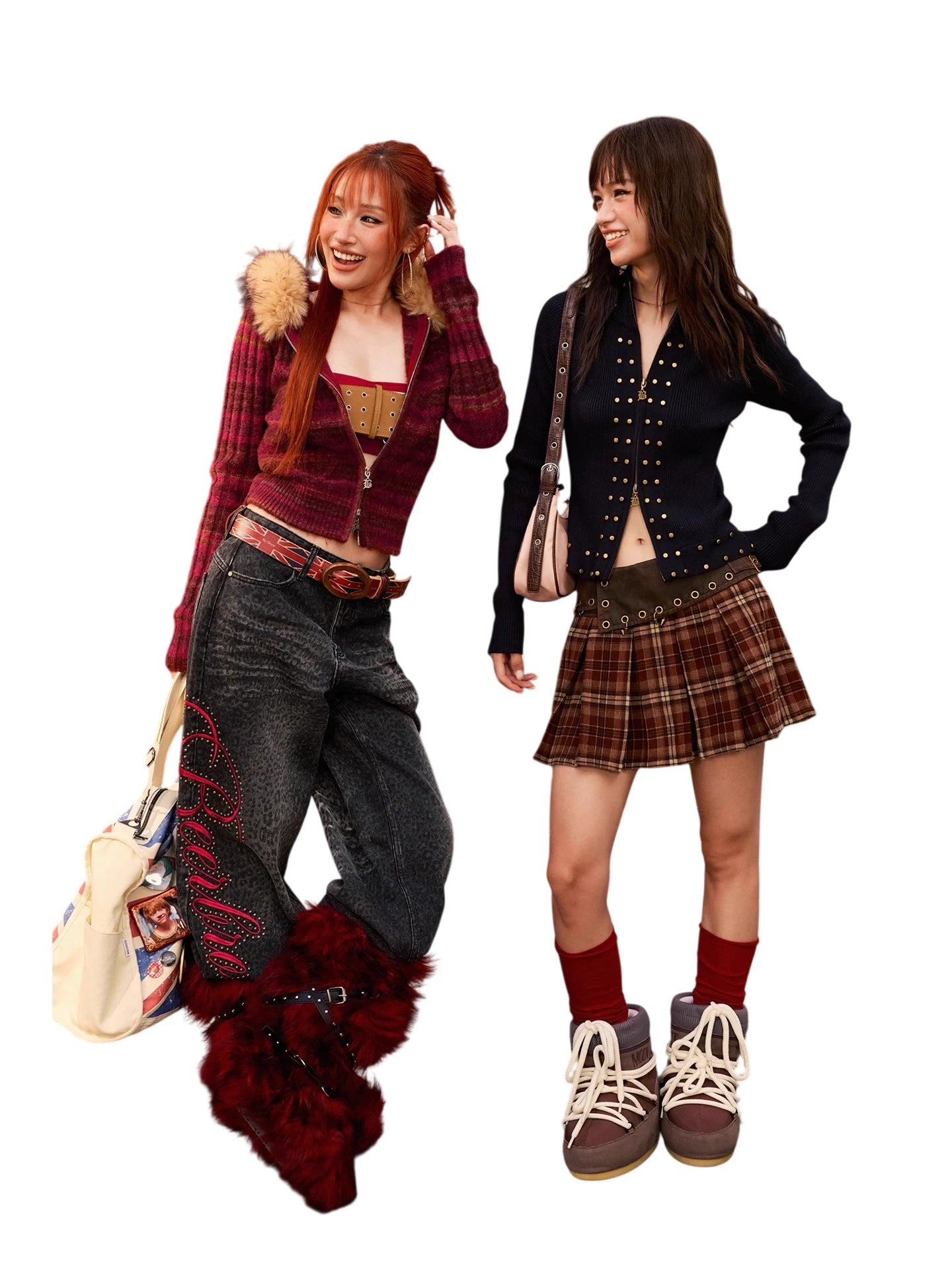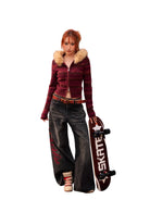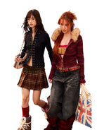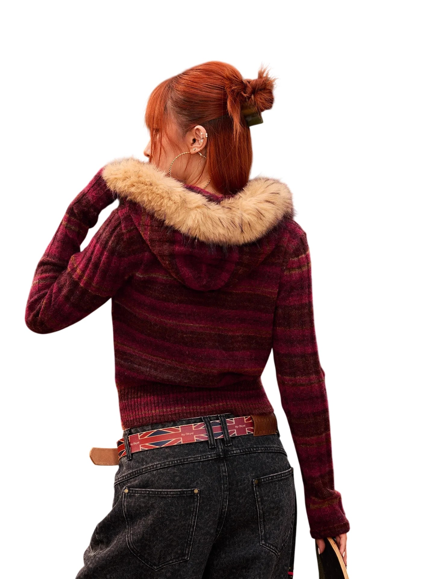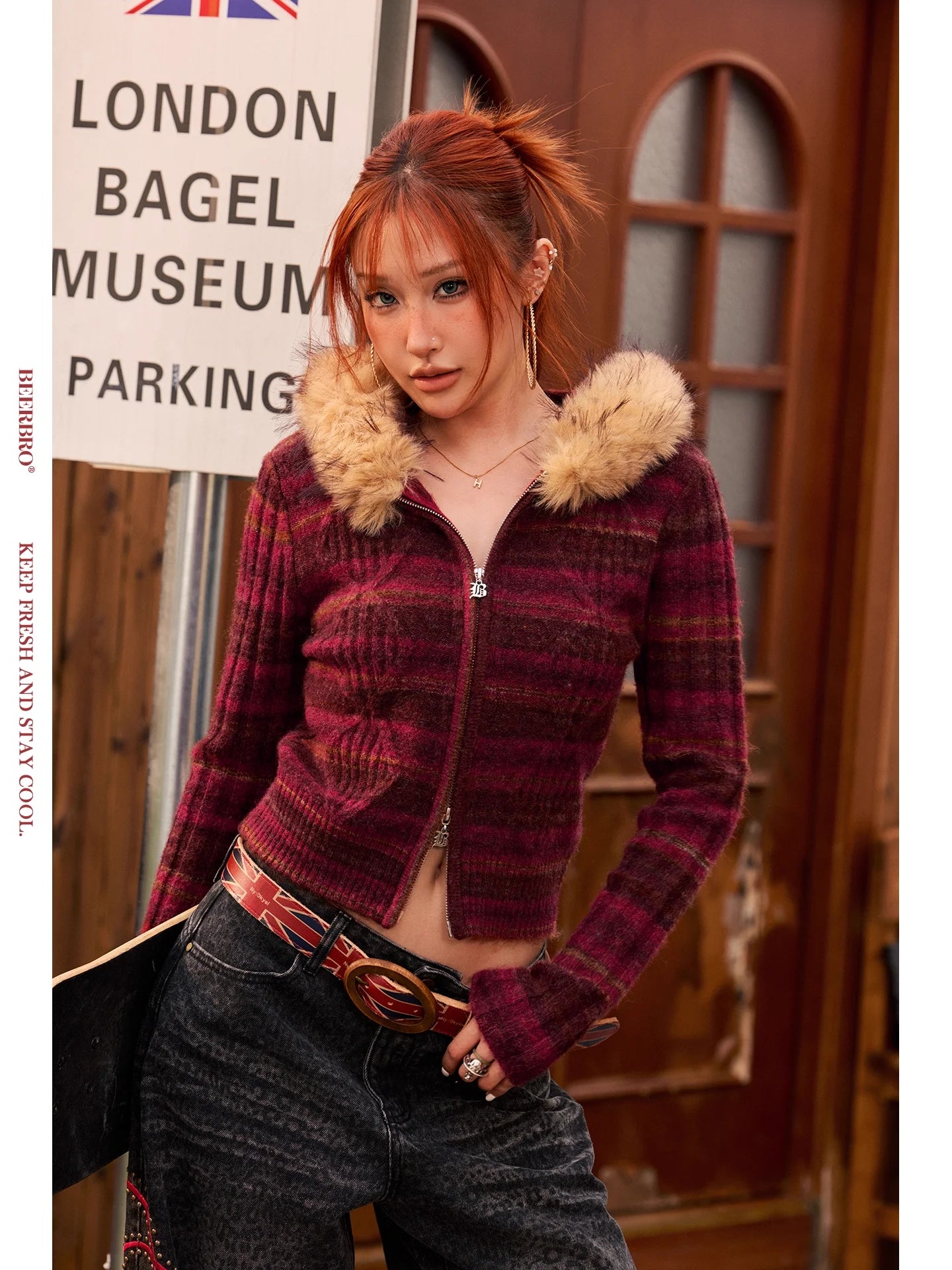 Stay stylish and warm in this women's slim fit sweater jacket crafted from soft merino wool. Featuring a rich maroon and dark plaid pattern, this zip-up design enhances your silhouette with a tailored fit. The hood is trimmed with plush faux fur in a light tan shade for added warmth and elegance. Perfect for creating a chic, street-style look that's both cozy and refined.