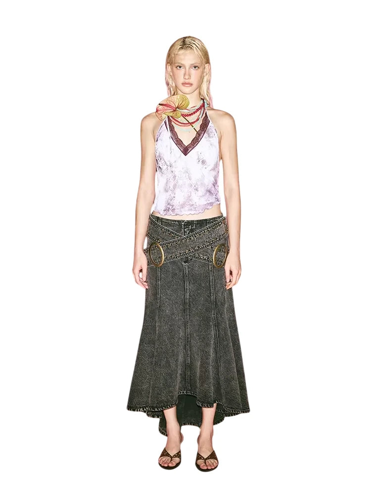 Elevate your summer style with this chic women's camisole top featuring a trendy snake print design in shades of purple and grey. Crafted from lightweight mesh fabric, it offers a slim fit and a stylish halter neckline trimmed with elegant dark lace. Perfect for pairing with your favorite denim, this sleeveless top adds a bold and fashionable touch to any warm-weather ensemble.