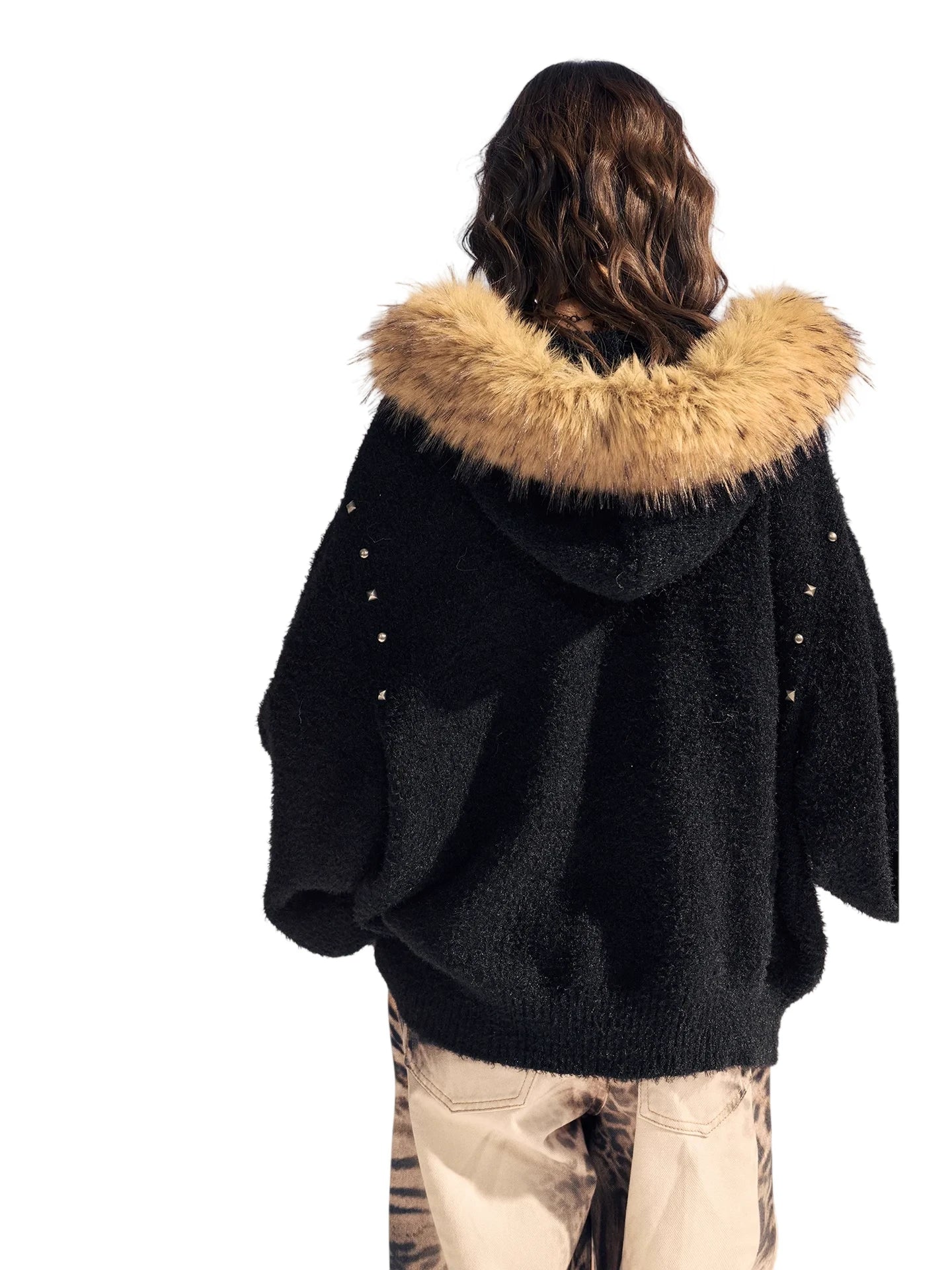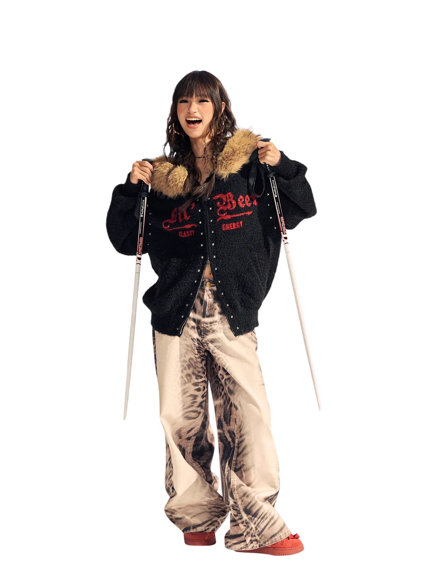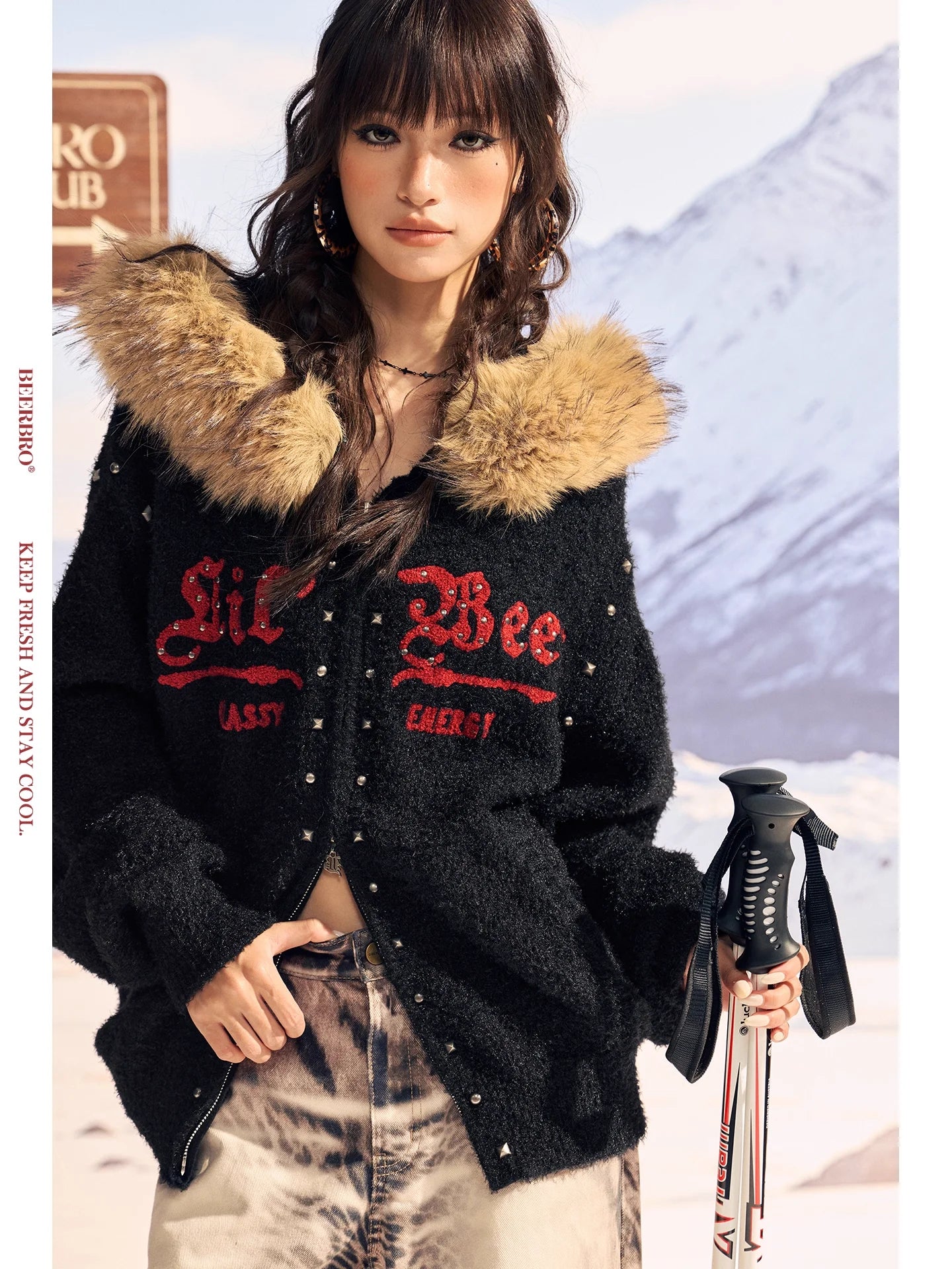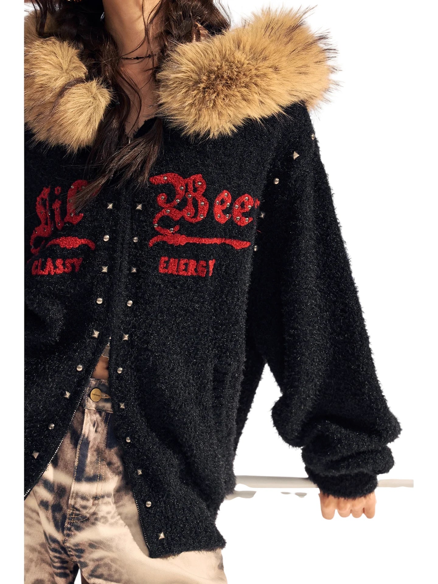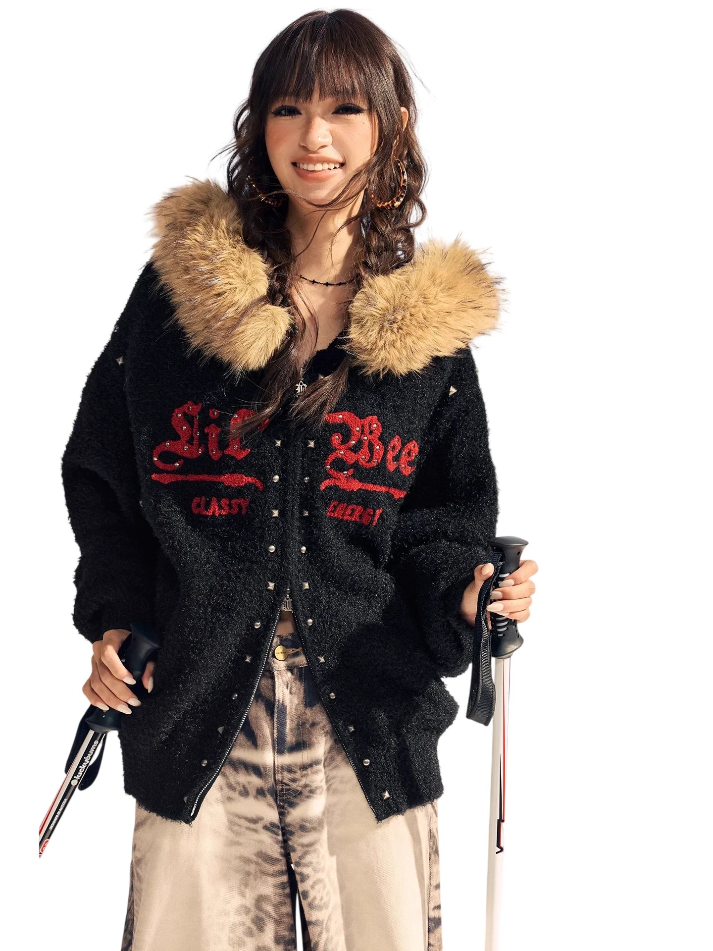 Stay warm and stylish with this comfortable fleece jacket designed for women. Made from soft cotton material, it features a cozy light brown faux fur collar for added warmth and texture. The black jacket showcases decorative metallic studs and red embroidered details with the words "Lil Bee," "LASTY," and "CHERRY" for a unique aesthetic. With its loose-fitting, button-down design, this jacket is perfect for cold-weather adventures and outdoor settings.
