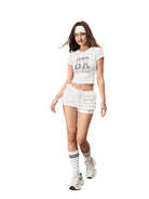 Stay cool and stylish with this women's summer two-piece outfit featuring a casual crop top and coordinating ruffle shorts. The short-sleeve t-shirt comes with bold printed lettering and playful star and stripe accents, while the layered ruffle shorts offer a flattering fit with a comfortable drawstring waist. Perfect for lounging or casual outings, this set combines relaxed comfort with trendy flair for a youthful, carefree look.
