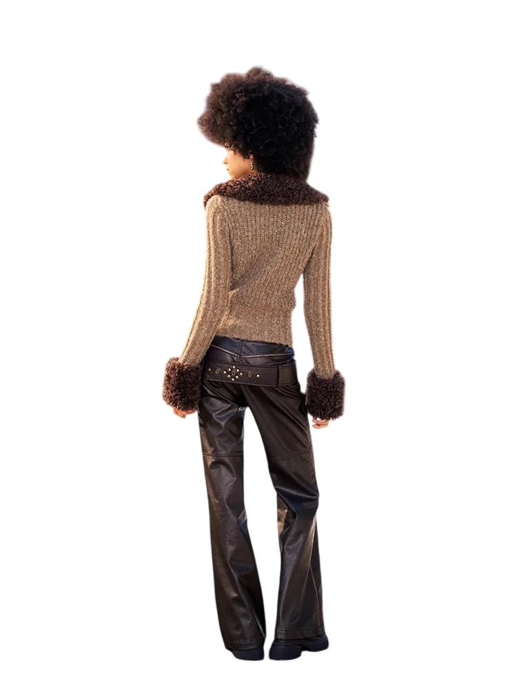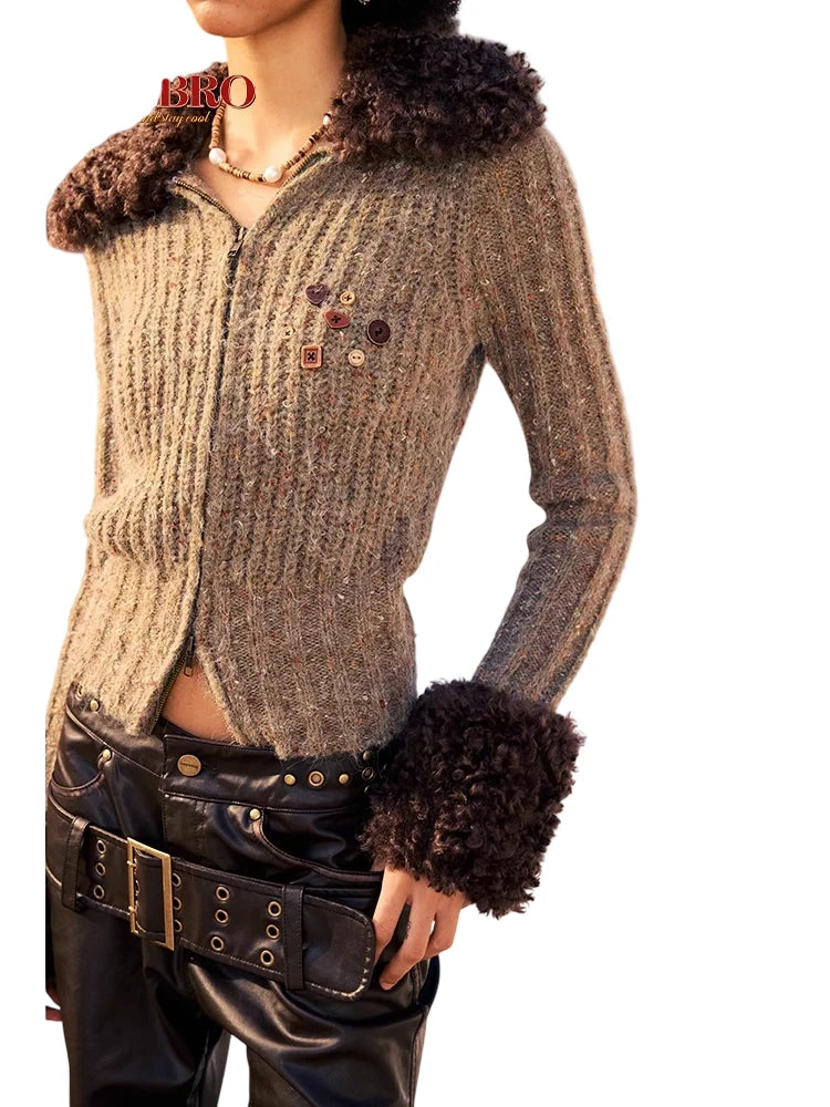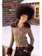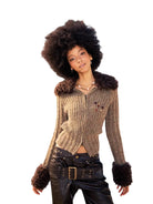 Embrace cozy elegance with this vintage-inspired cardigan sweater for women. Designed in a muted olive-brown knit with a ribbed texture, this thick zip-up sweater features a flattering short cut and a fitted silhouette. The standout details include a plush faux fur collar and matching cuff accents in a contrasting darker brown tone for added warmth and style. Perfect for chilly days, whether you're lounging or exploring the outdoors, this sweater adds a timeless touch to any winter wardrobe.