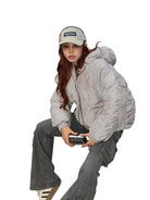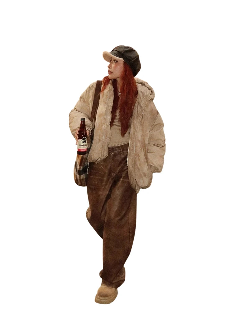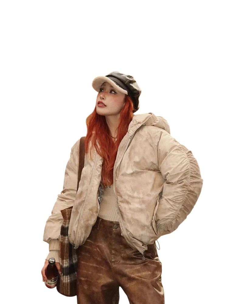 Stay warm and stylish with this vintage-inspired winter jacket for women. Crafted from thick, textured cotton, this solid-colored puffer jacket features a ruched design that adds a touch of elegance to its oversized silhouette. The cozy hood and ribbed cuffs offer added protection against the cold, making it perfect for chilly urban adventures. Pair it effortlessly with your favorite winter ensemble for a timeless, street-ready look.