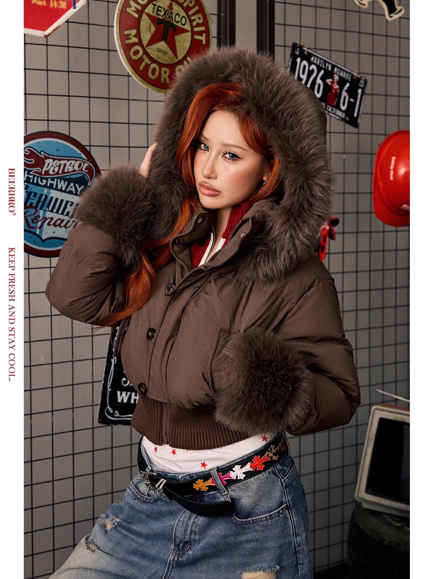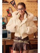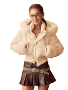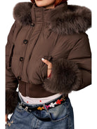 Stay cozy and stylish in this women's lightweight duck down puffer jacket, ideal for autumn and winter seasons. This warm, cropped coat features a padded design in a rich chocolate brown shade and includes a luxuriously oversized fur-lined hood and matching fur-trimmed cuffs for enhanced warmth and elegance.