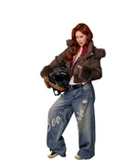 The jacket closes with a buttoned front and is fitted with a ribbed knit waistband for a flattering silhouette. Perfect for layering, it adds a fashionable touch to any cold-weather outfit and complements casual attire like denim jeans for an urban edge.
