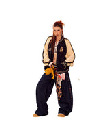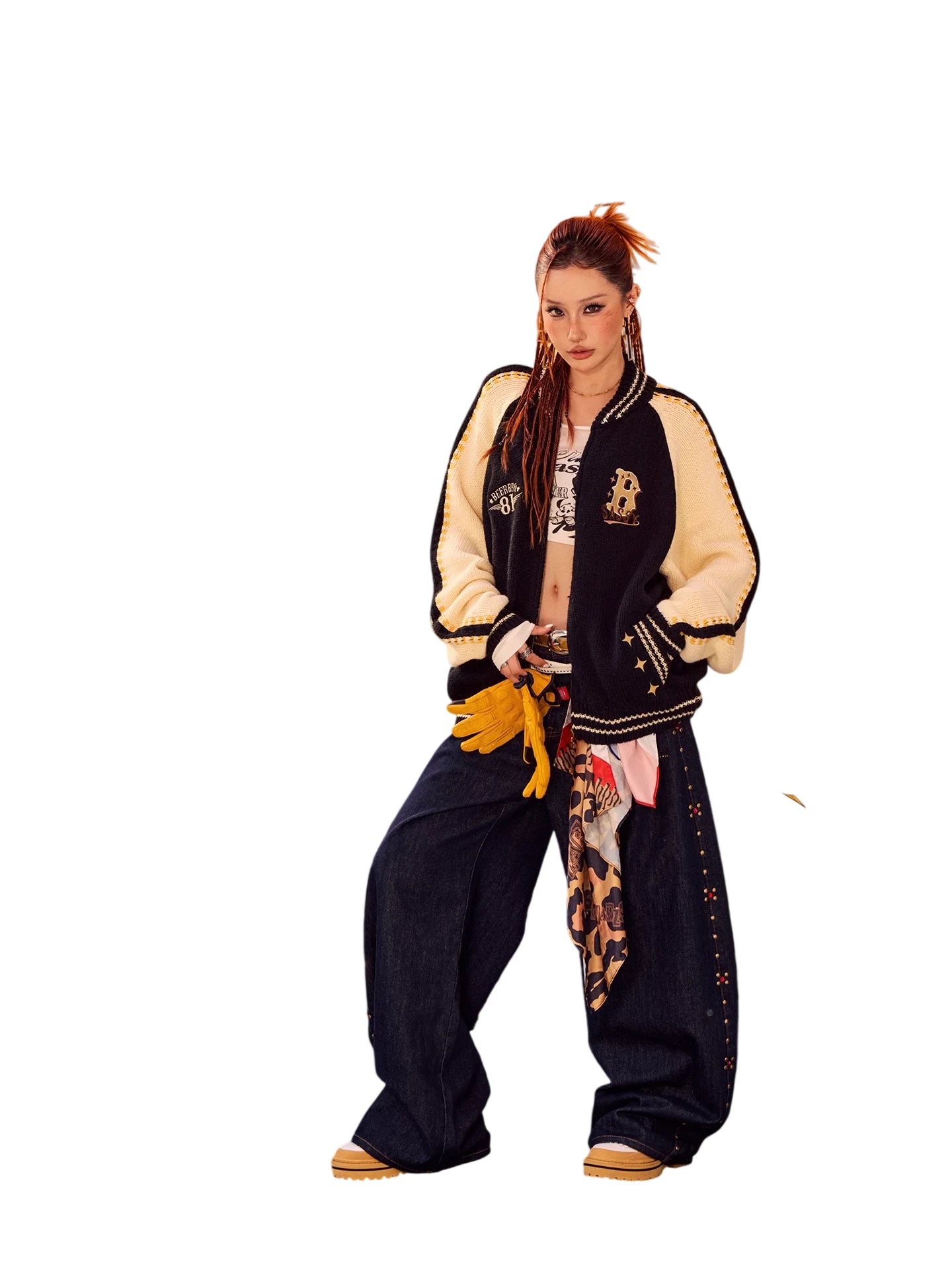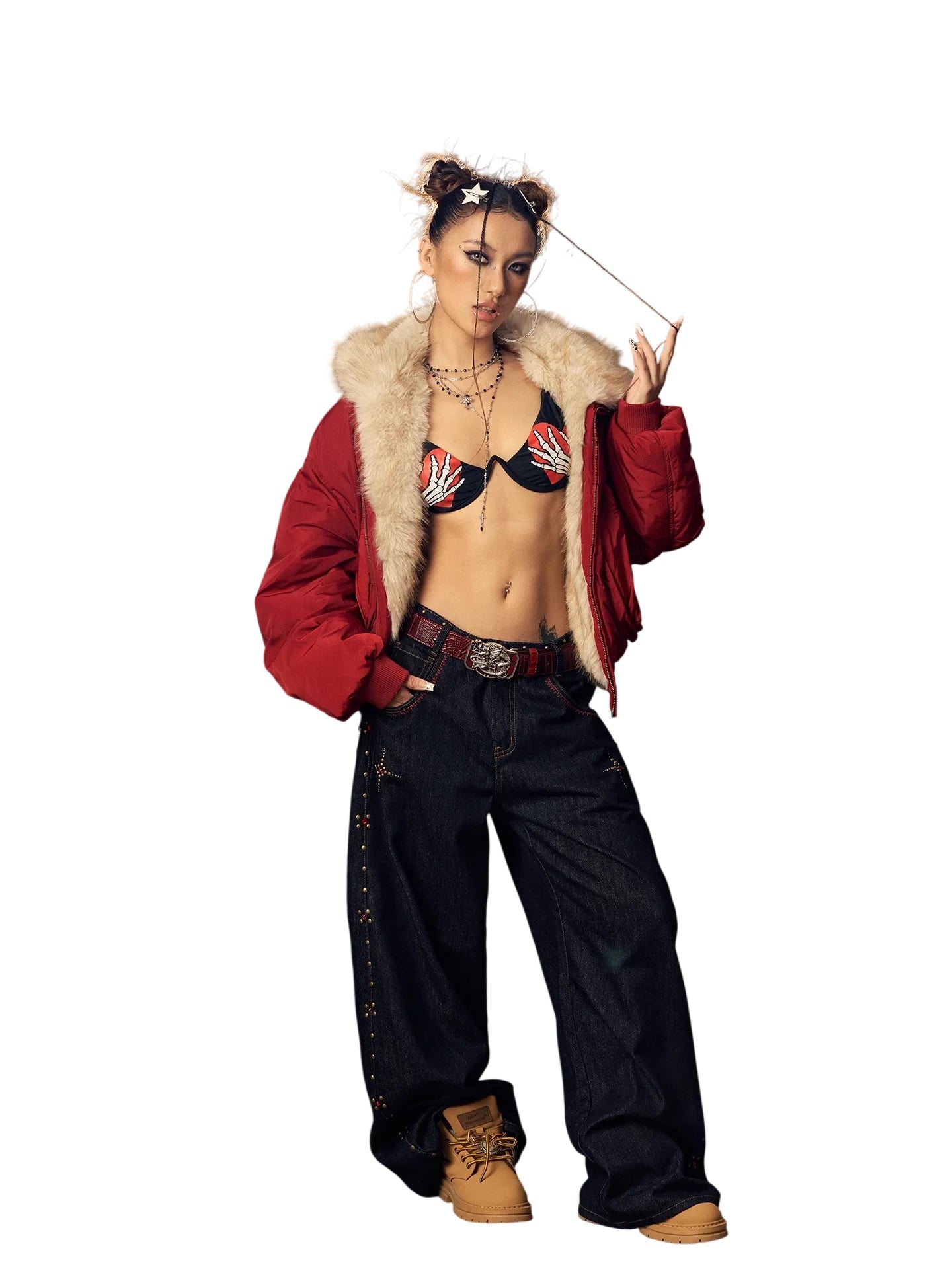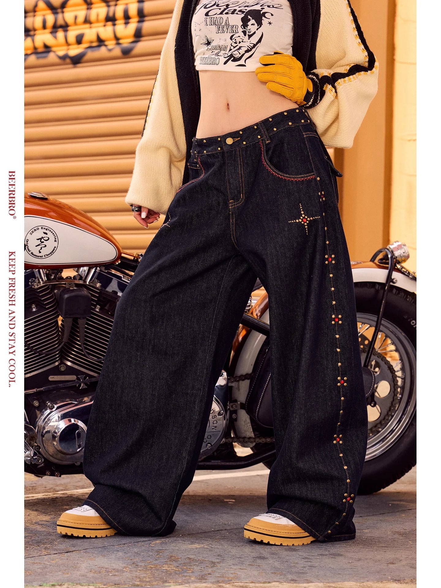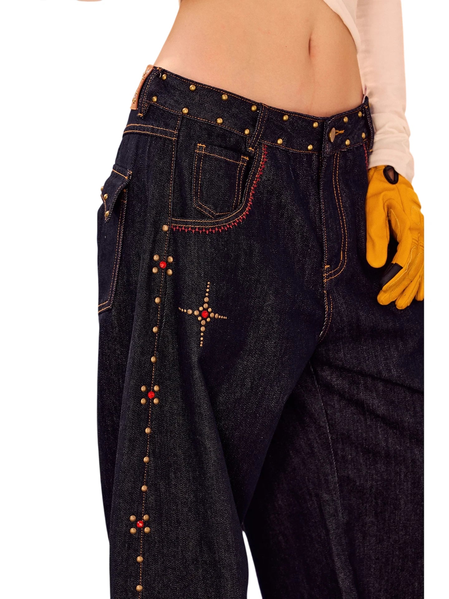 Elevate your streetwear style with these women's wide-leg raw denim jeans, designed for fall and winter. Featuring bold red stitching and playful bead and stud embellishments in star and line patterns along the side seams, these jeans offer a unique and edgy look. The high-waisted fit is enhanced by metallic-studded detailing at the belt line and functional front pockets. Perfect for curated casual outfits with a statement flair.
