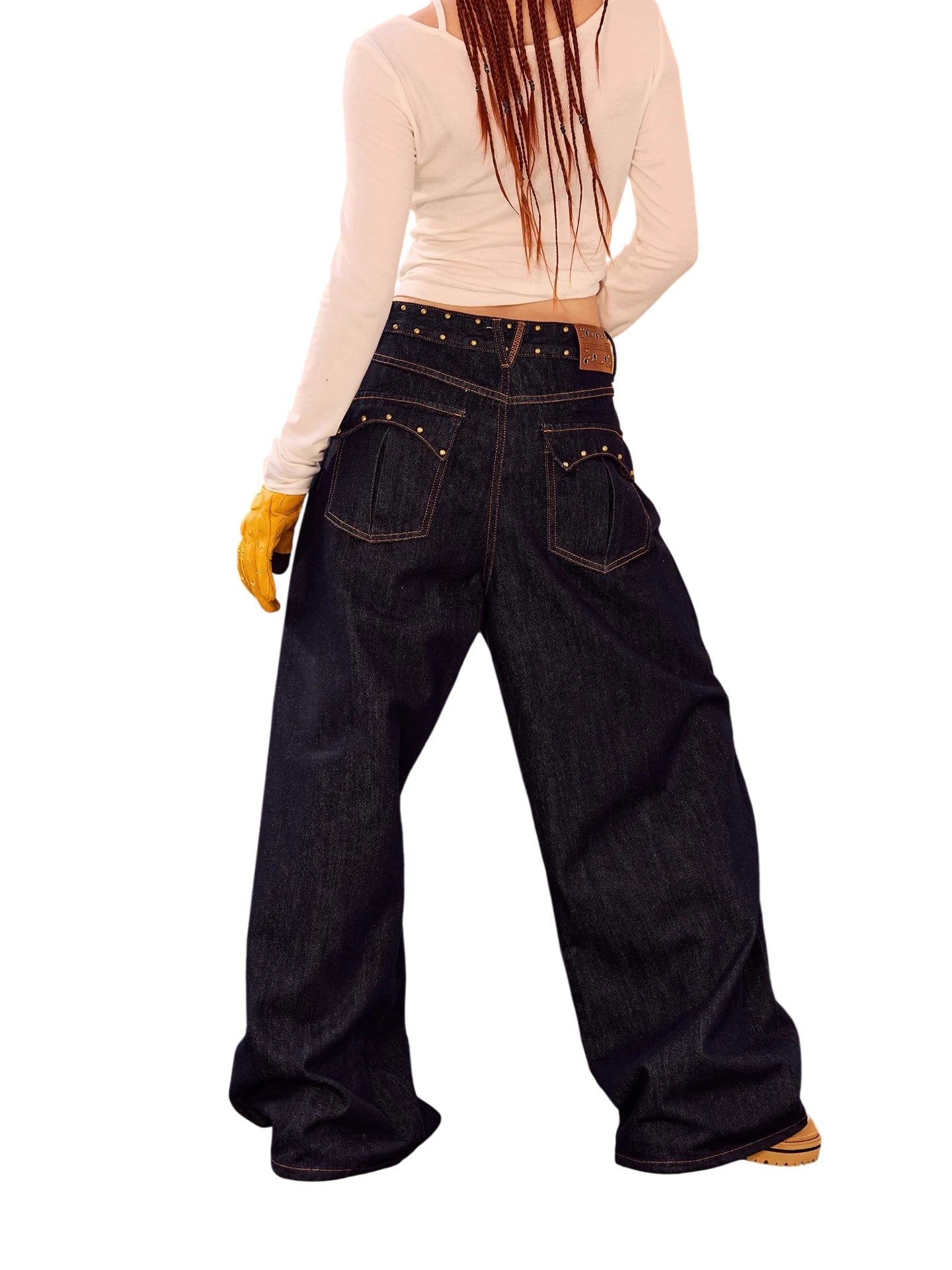 BeerBro Women's Wide-Leg Raw Denim Jeans with Side Stud Detailing