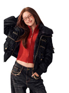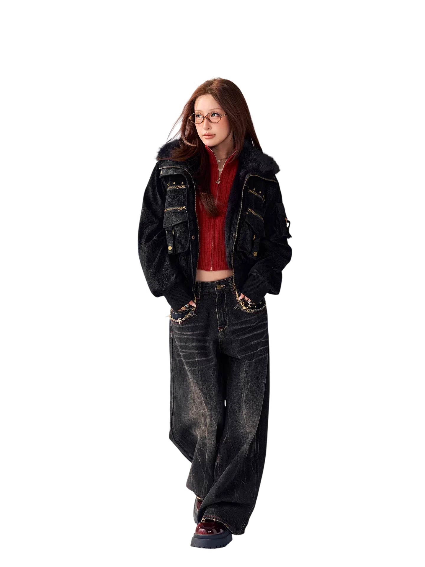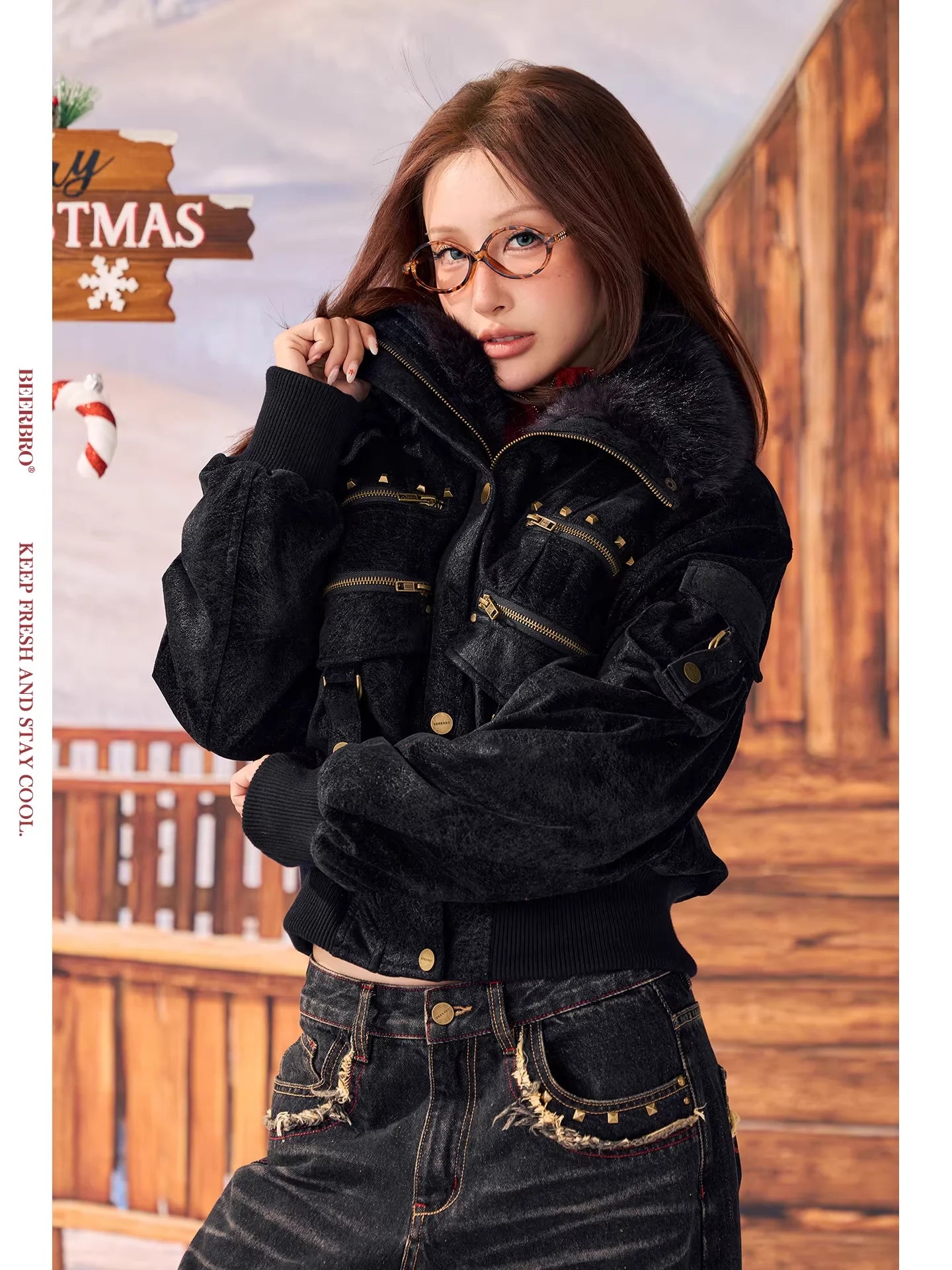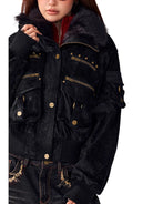 Stay warm and stylish in this women's short winter jacket, crafted from plush black velvet and lined with soft fleece for added insulation. The jacket features a turn-down padded collar and an array of gold hardware, including decorative zippers and buttons, adding a touch of edgy sophistication. Designed with multiple front pockets, it's both fashionable and functional, ideal for cold-weather wear. Perfect for completing your winter look with a modern flair.