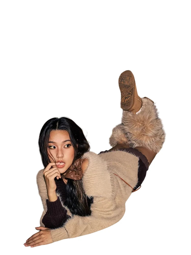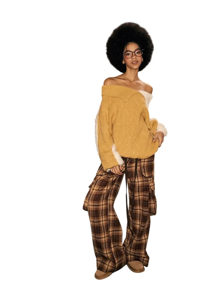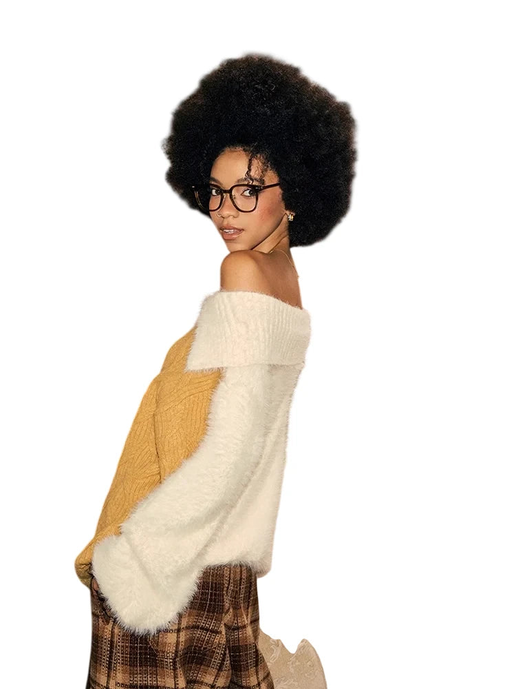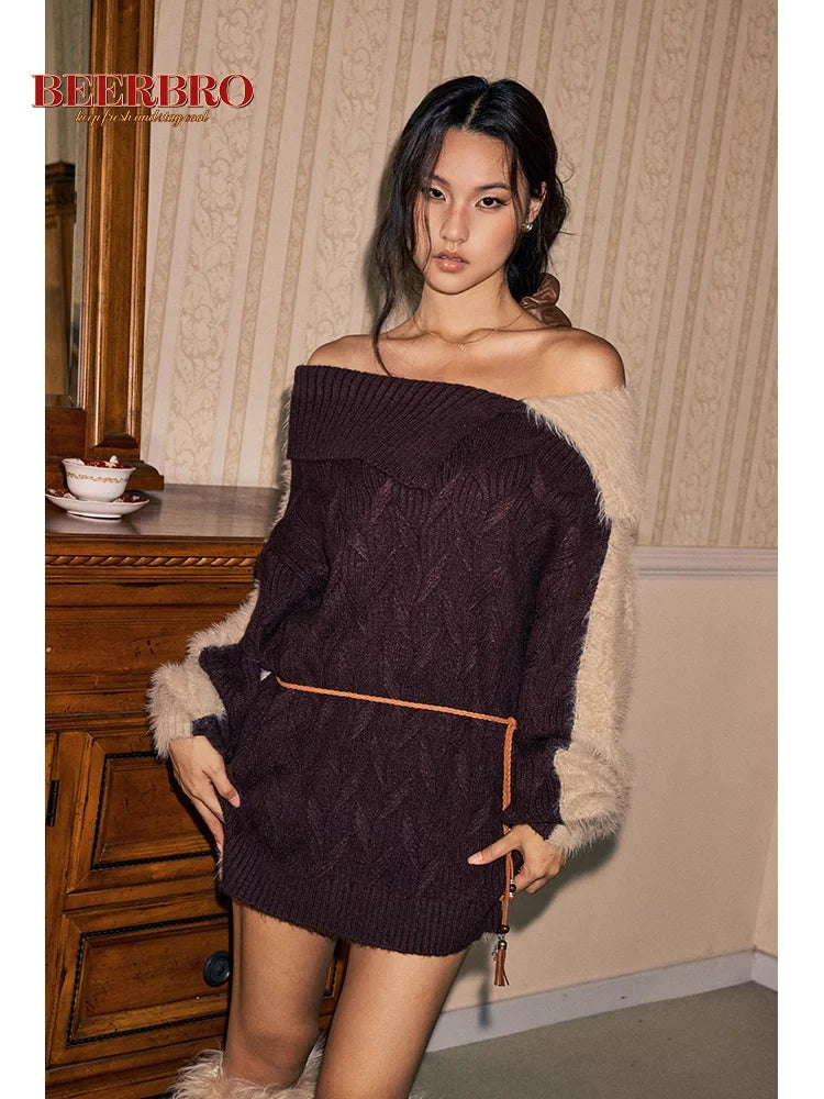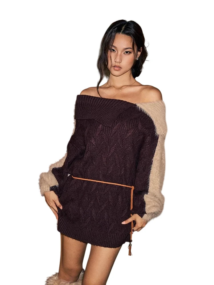 BeerBro Off-Shoulder Colorblock Faux Mink Knit Sweater