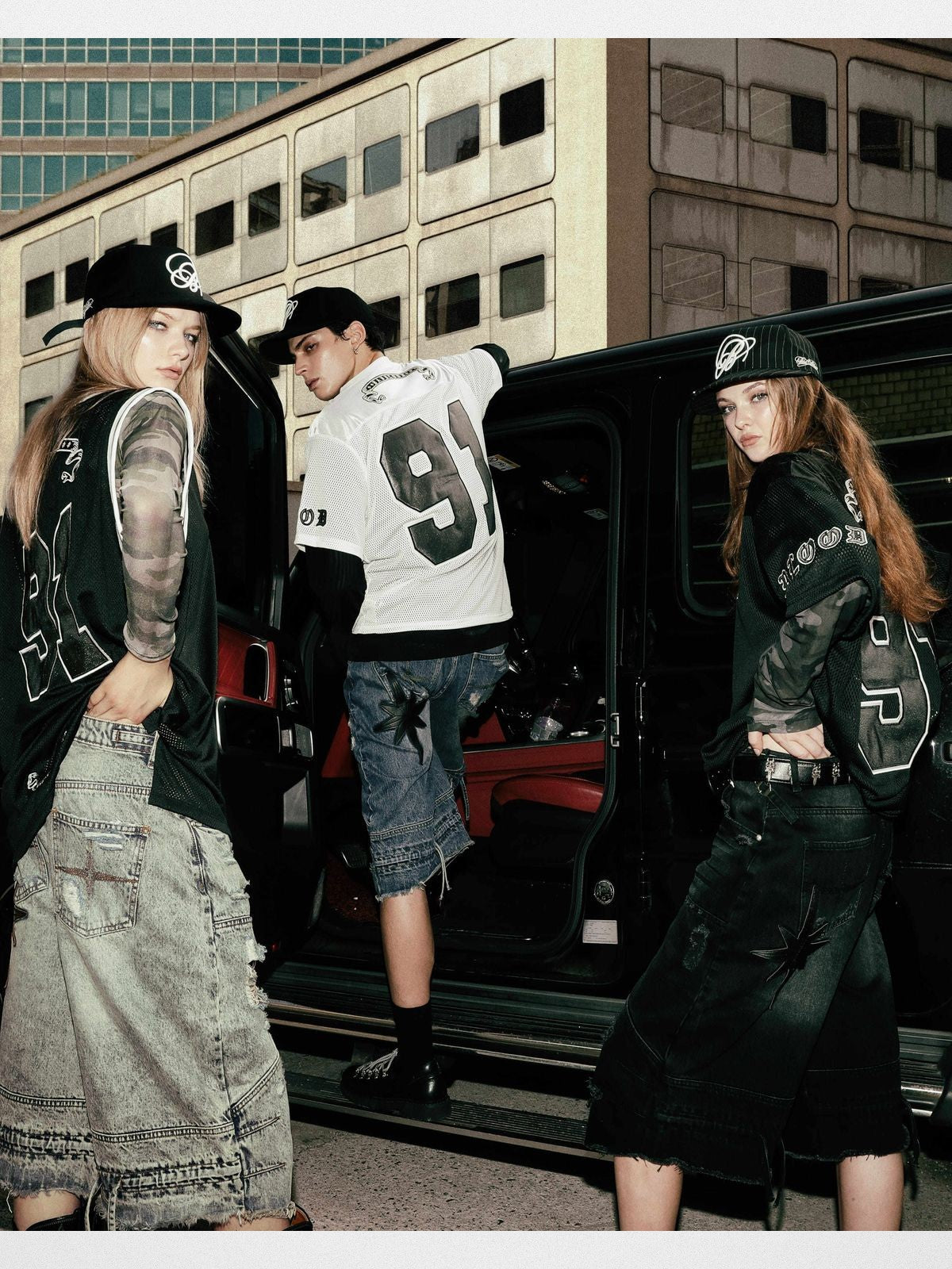 BADSEED's Bermuda shorts in 100% cotton denim. Features heavy distressing with raw hems, curved knee panels, and adjustable side waist buckles.
