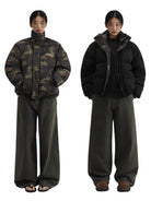 Stay warm and stylish with this reversible women's puffer jacket featuring a dual-look design. One side showcases a bold camouflage pattern, while the reverse reveals a sleek solid black finish with subtle camo detail on the collar. The jacket is insulated with 90% white duck down, offering exceptional warmth for cold weather. Designed for a relaxed, oversized fit, it pairs effortlessly with casual or urban outfits. A high collar and zip-up front add practicality and a modern edge to this versatile wardrobe essential.