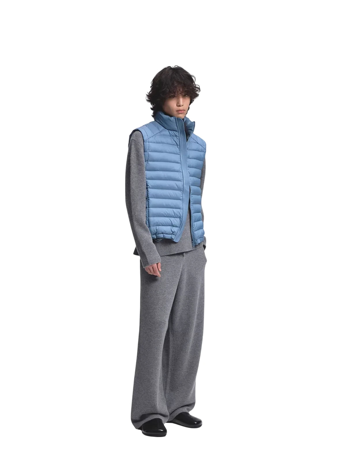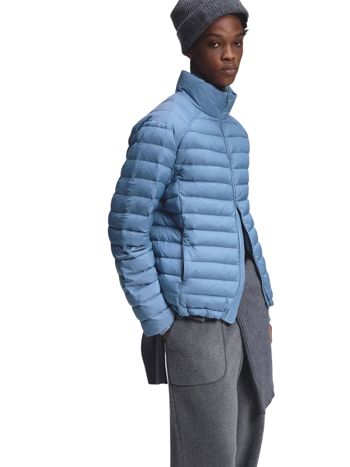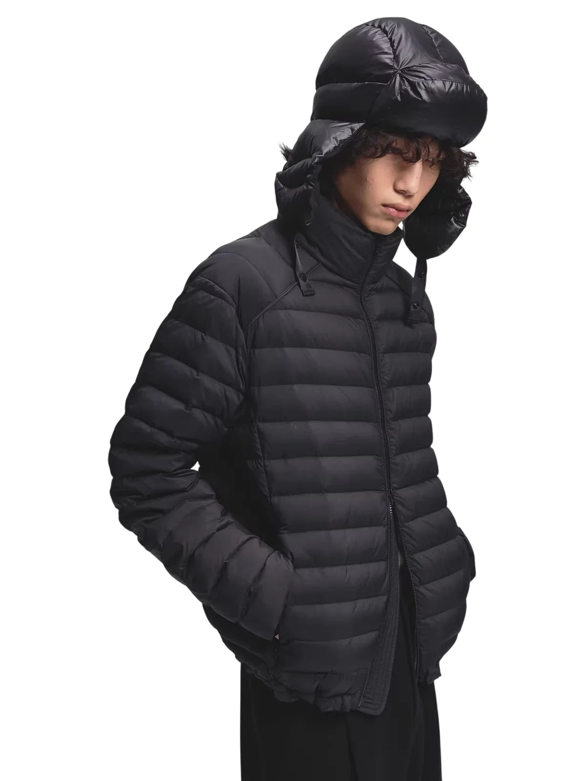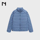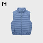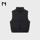 This men's lightweight short puffer jacket vest features premium white duck down insulation for superior warmth and comfort. Designed with a crinkled texture and ribbed detailing, it adds a modern and dynamic touch to your winter wardrobe. The high-collar style ensures extra protection against cold weather, making it ideal for layered looks. Perfect for the stylish man seeking functionality with a contemporary edge.